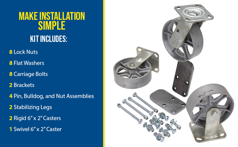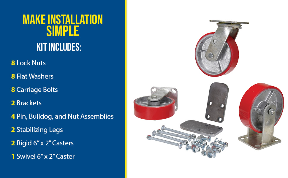 H-CK3-SC6-2HD H-CK3-SC6-2HDDuctile Steel Caster Kit 6 In. x 2 In. 6,000 Lb. Capacity MaroonUniform Capacity per caster (lb.): 6000