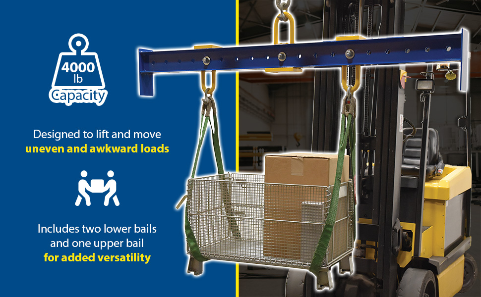 Lift uneven loads and keep them level with increased safety. Includes two lower bails and one upper bail. Adjust bails in 4" increments. The bails slide between two 5" high C-Channels (8" high model SBM-80). Meets ASME B30.20-1993 standard. Baked-in powder-coated finish for added toughness.
