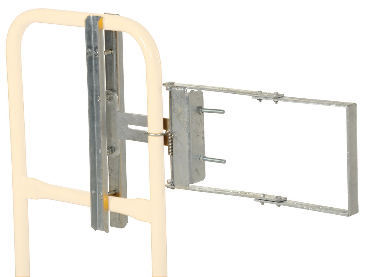 Customize your safety railings with Self-Closing Steel Gates. Gates can be mounted from the left or right with the included mounting hardware. Mount to horizontal rails that measure up to 2" diameter and are spaced 10" to 21" apart center to center. Choose from galvanized or yellow powder coat finish. Meets OSHA 1910.28(b)(3)(iv) requirements. (Railing and base not included.)