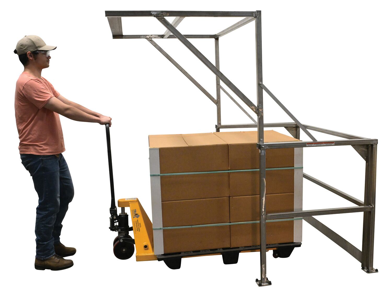 MEZZ-200The Mezzanine Safety Gate provides an OSHA required 42-3/8" high handrail, 21" high mid-rail, and 4" high toe board for mezzanines without sacrificing load accessibility. To accommodate the maximum load height of 68", when utilizing a standard 48"W x 48"D pallet (two standard, side by side pallets for models MEZZ-200-DW & MEZZ-200-DW-SS) load positioning within the gate is critical. For greatest amount of clearance and item placement flexibility, shorter loads are recommended. Gate design is balanced to allow for easy operation without use of springs. Baked-in powder-coated toughness. Welded steel construction.
