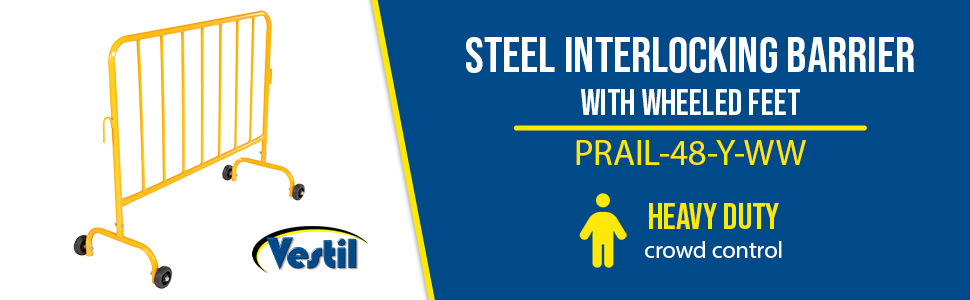 PRAIL-102-Y-WF PRAIL-102-Y-WFSteel Crowd Control Interlocking Barrier with Feet (1) Wheeled (1) Flat 101-3/16 In. Length YellowVertical Bar Spacing (in.): 5-7/8