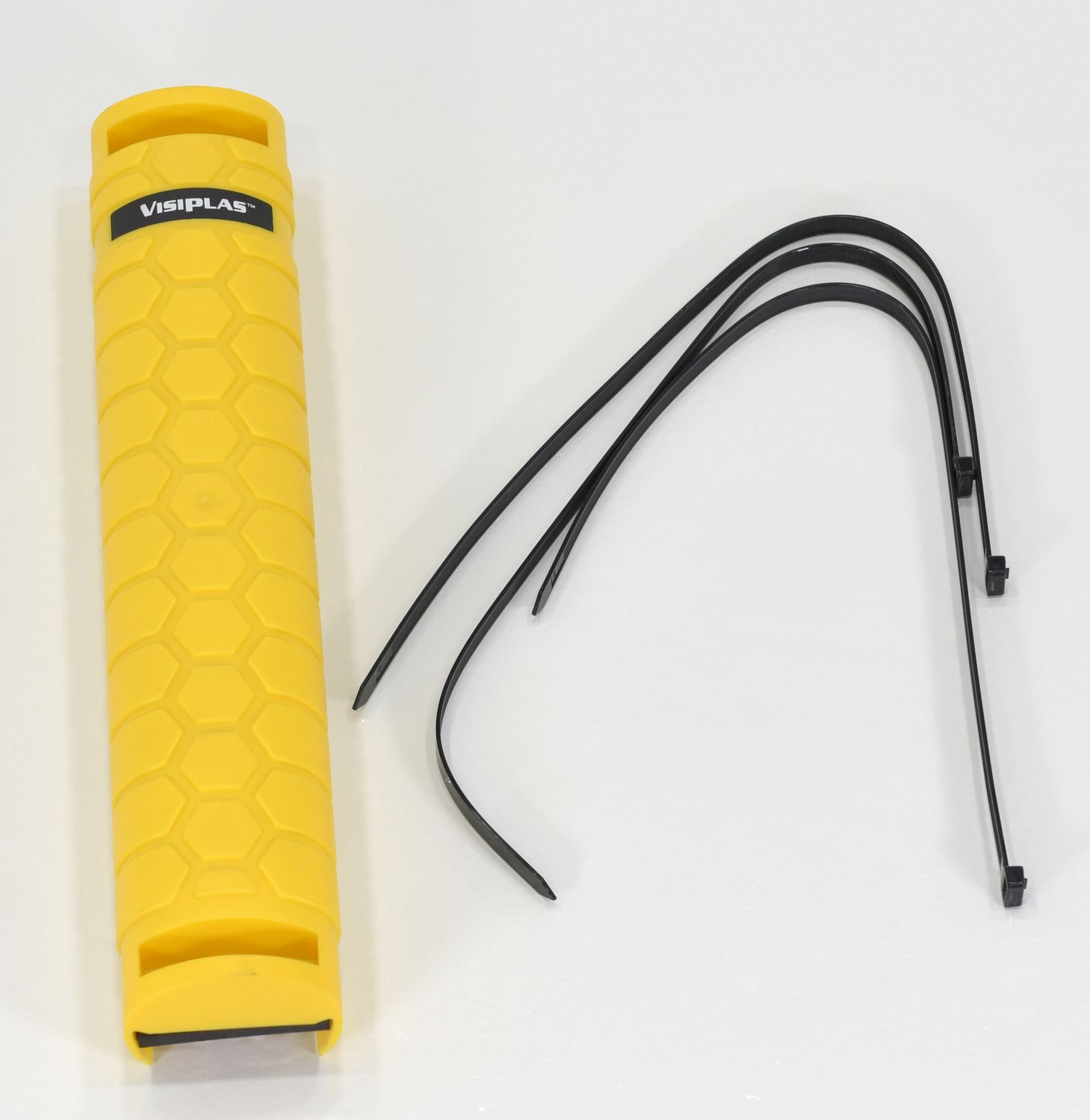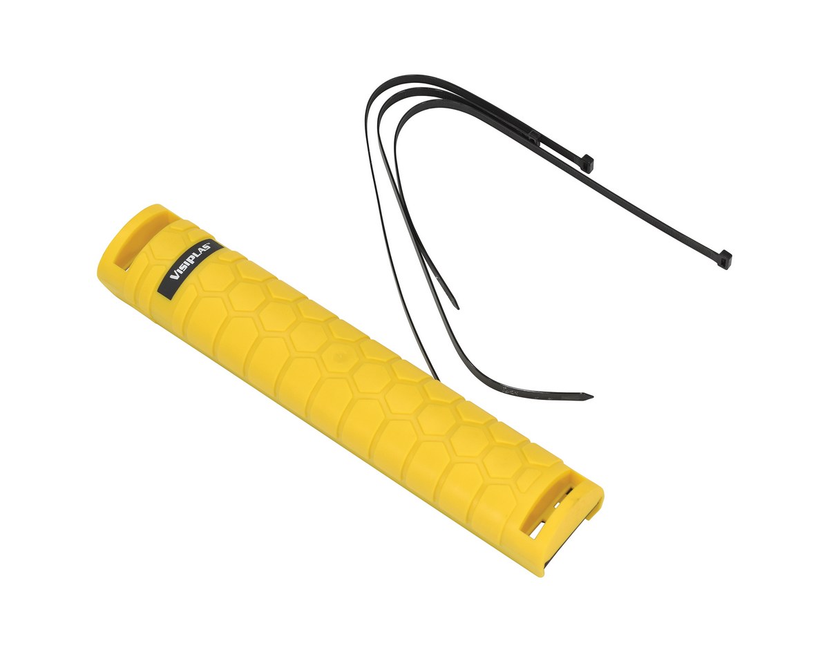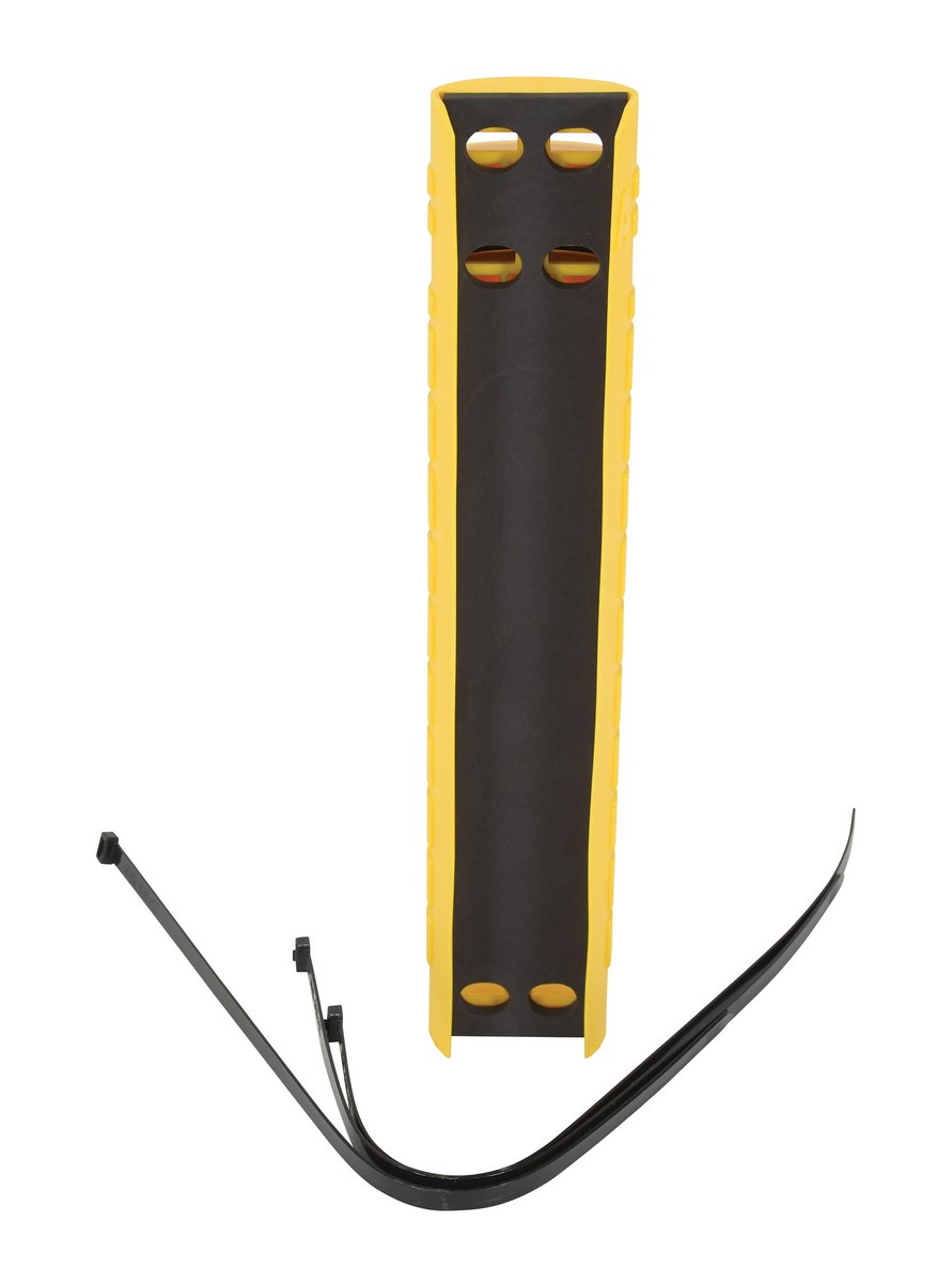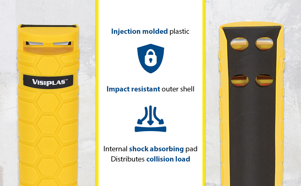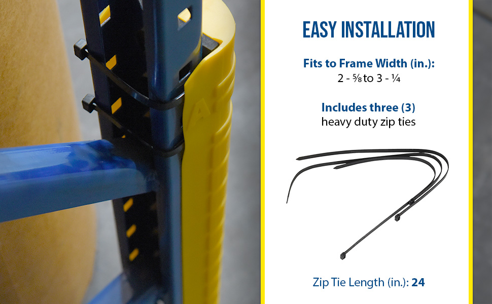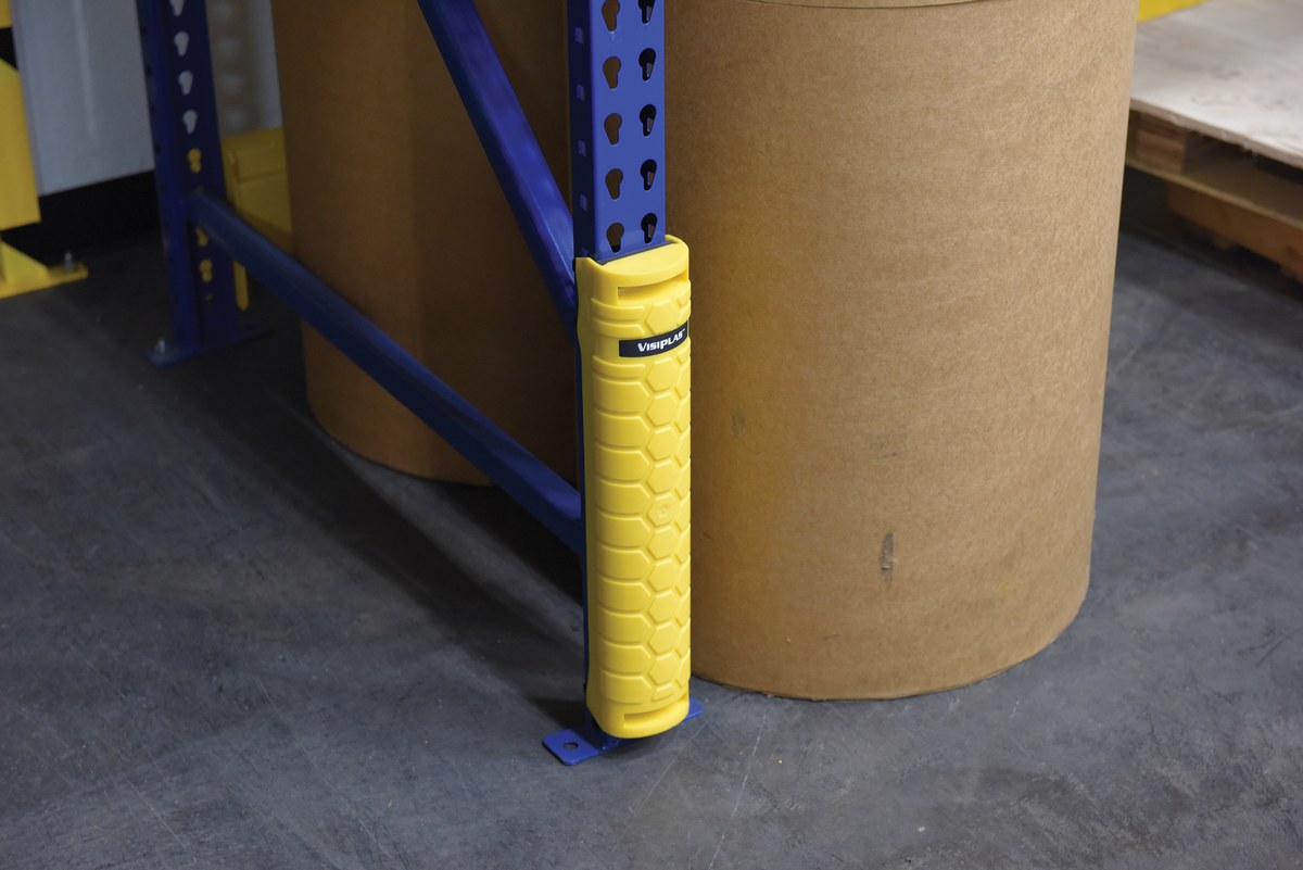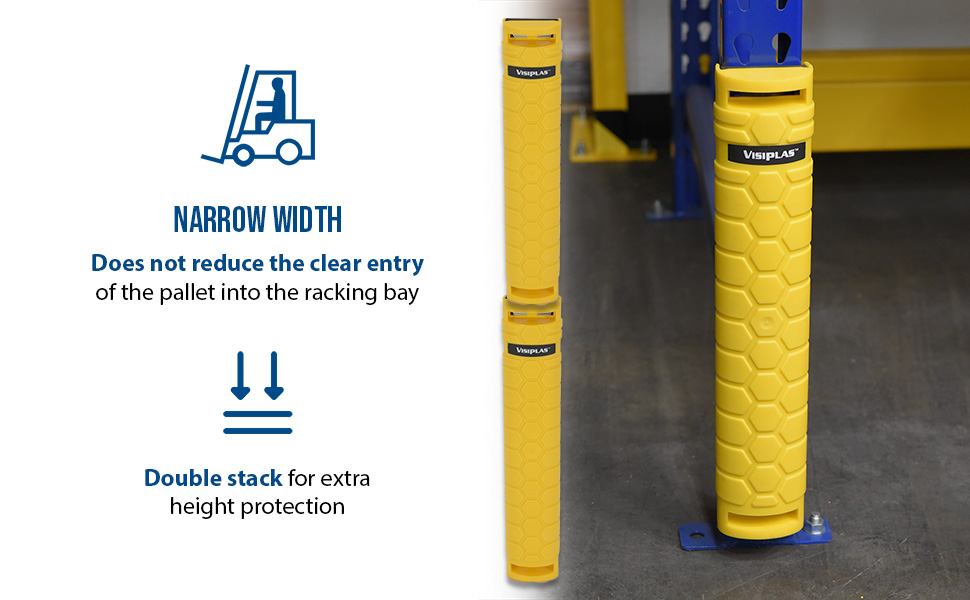 Impact resistant blended polyethylene outer shell. Internal shock absorbing pad for added protection. Double stack for extra height protection. Does not require bolting to the floor. Quickly attaches to pallet rack frame with (3) zip ties, included. High visibility fluorescent yellow color.