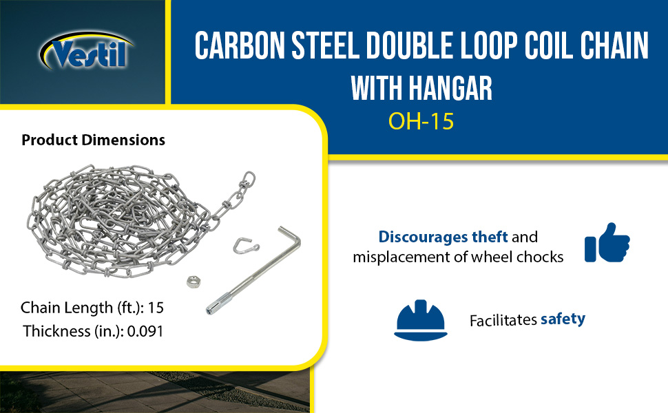 Chain and Hangers - Discourage theft and misplacement of wheel chocks. Facilitate safety in the dock area. 15' chain attaches to the hanger. Hanger is then secured to the dock wall. Chain is fastened to the chock with cold shut. OH-15-YEL bright color for clear visibility.