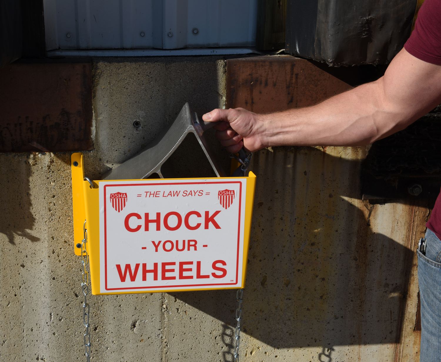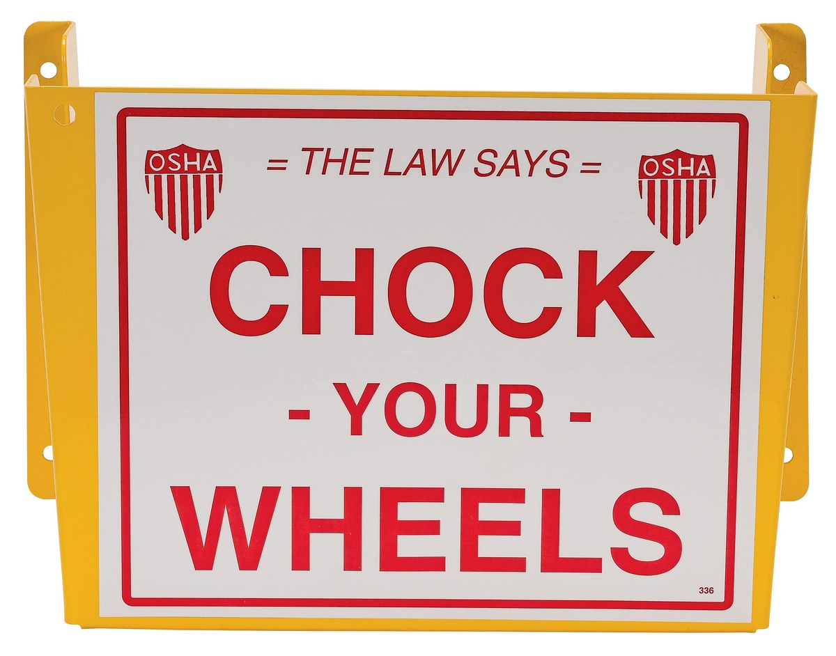 Wheel Chock Holders - Keep wheel chocks safe and prepared for use at any moment. The holder features steel construction for long life and durability, baked-in powder-coated toughness for visibility and predrilled mounting holes for easy attachment. Model WC-H-R includes a vinyl sticker attached to front of holder which reads "The Law Says CHOCK YOUR WHEELS".