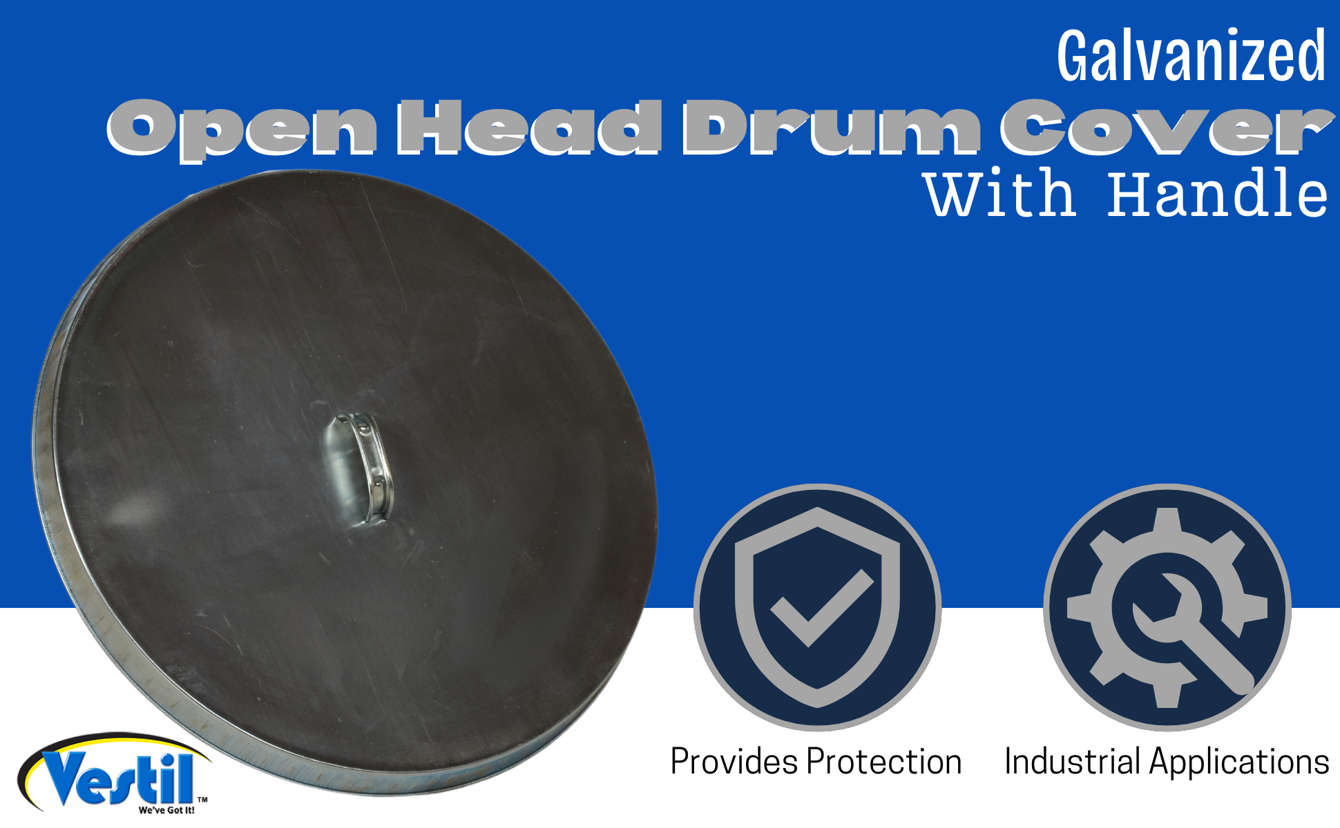 Galvanized Steel Drum Covers [Prop 65 Warning] for 55 gallon drums. Manufactured from 26 gauge galvanized steel. Cover drum tops for added protection. Perimeter rim is beaded for safety.