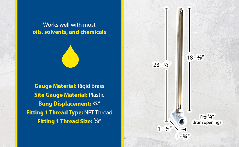The DGLI-4 allows personnel to read the level of contents in a drum. Accommodates 3/4" faucet. 18-3/8" site gauge. For use with plastic or steel drums. Works well with most oils, solvents, and chemicals. Faucets sold seperately.