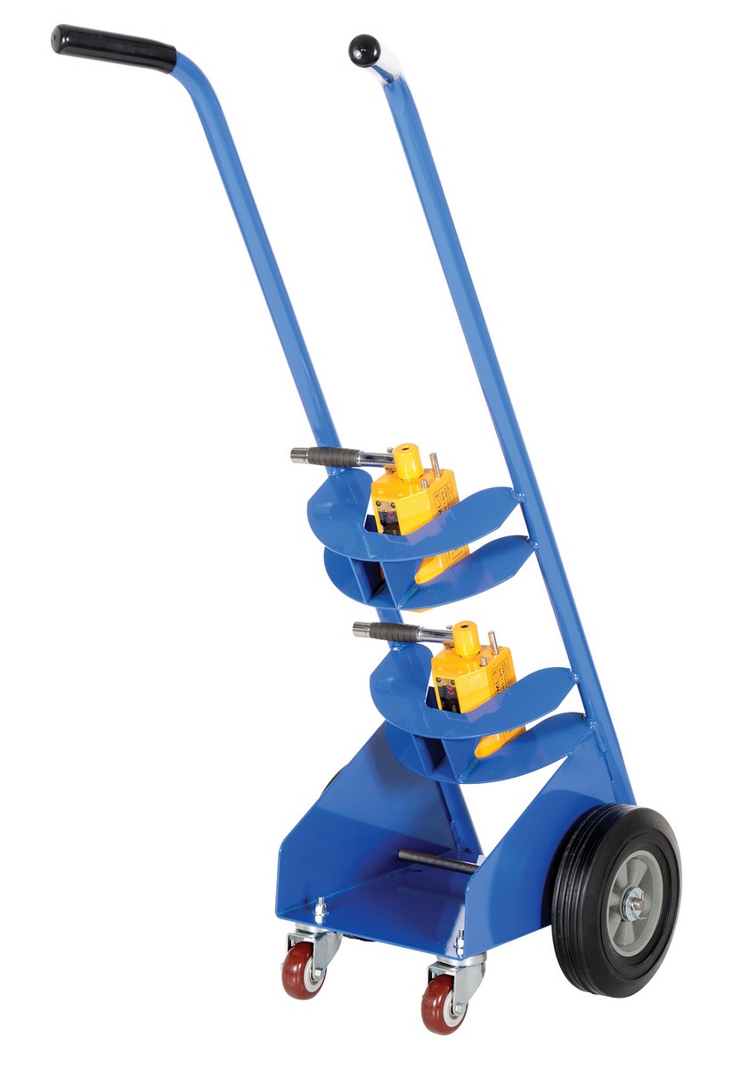 Designed and built to transport gas cylinders with ease, this hand truck uses strong magnets to hold the tanks in place. Units rolls easily on two (2) 10" x 2-1/2" rubber tires and two (2) 3" x 1-1/4" swivel casters. The tilt back design allows for effortless transportation. Baked-in powder-coated toughness.