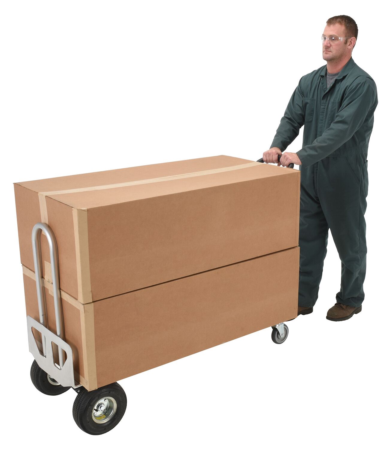 Maximize control for different types of loads. These hand trucks can transport boxes wherever they are needed. Transport loads smoothly and evenly over rough or uneven floors. 10" diameter pneumatic tires are standard on all hand trucks, except for ALUM-H, ALUM-PIN, and ALUM-3-CONV, which are 10-1/2" tires. 10" diameter industrial solid rubber tires are also available. The convertible hand trucks also have 5"x 1-1/4" poly-on-steel swivel casters at the bottom of the handle. ALUM-SG (stair guides) are not compatible with the CONV models. Assembly required.