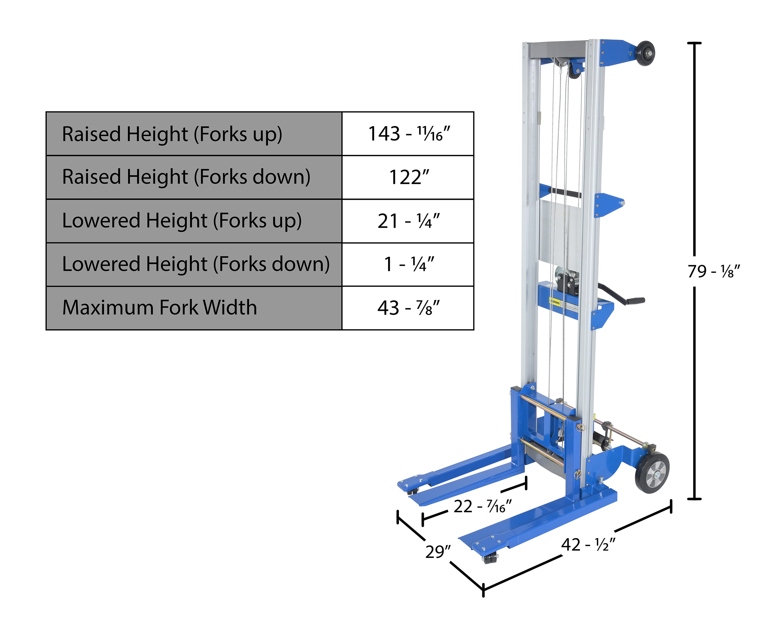Raised Height with Forks Up (in.): 143-11/16 Fork Width (in.): 4 Fork Height (in.): 1-3/4
