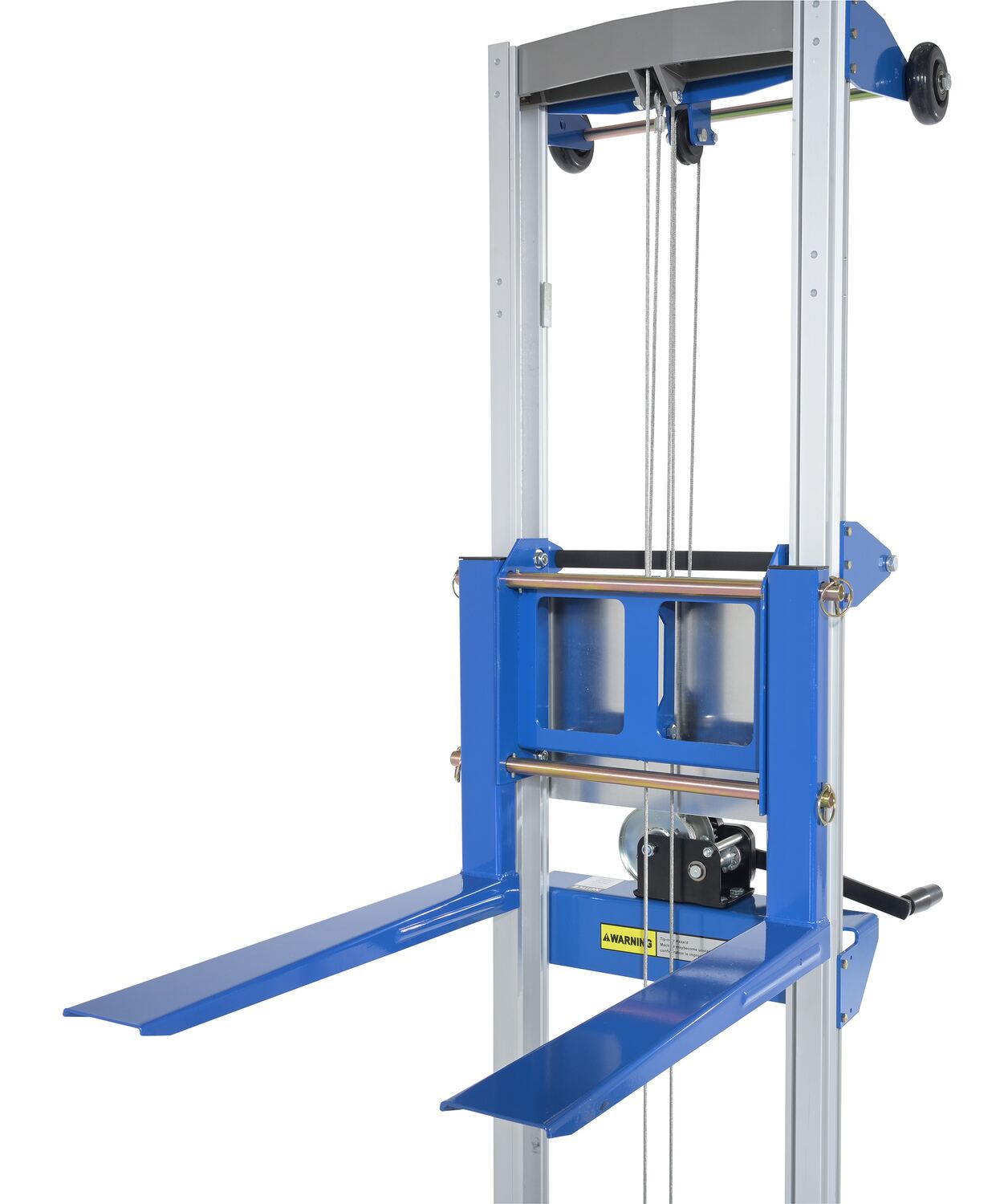 The hand winch lift truck is compact and designed to lift material to and from shelves, move office equipment, and install ceiling/wall appliances. It's constructed of durable steel-and-aluminum. Operated by a hand-crank winch that features a reversible handle and hold-down device for securing the carriage during transport.