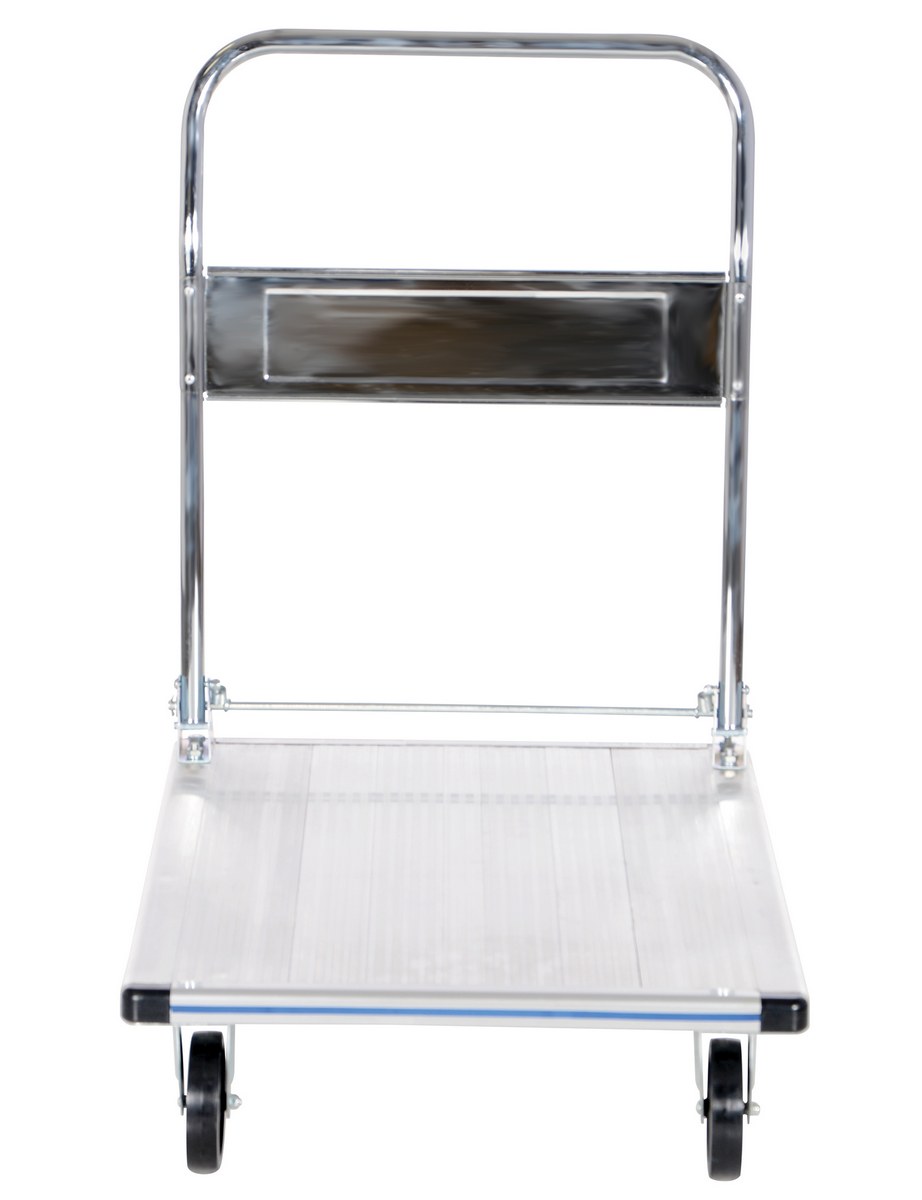 Aluminum Platform Truck With Polyurethane Casters 24 In. x 36 In. 600 Lb. Capacity SilverUse this Aluminum folding handle Platform Truck with non-marking casters for safe transportation of stacks of paper, small parts and other lightweight equipment. Ideal for maintenance rooms, offices, schools, hospitals, etc. Plastic corner protectors enhance durability and protect surroundings. The unit has a rugged aluminum construction with single handle design.