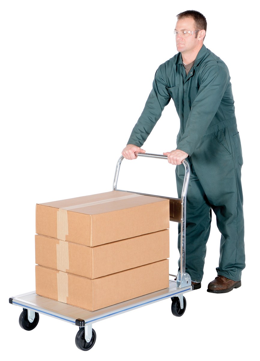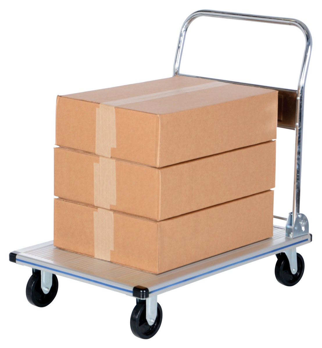 Use this Aluminum folding handle Platform Truck with non-marking casters for safe transportation of stacks of paper, small parts and other lightweight equipment. Ideal for maintenance rooms, offices, schools, hospitals, etc. Plastic corner protectors enhance durability and protect surroundings. The unit has a rugged aluminum construction with single handle design.