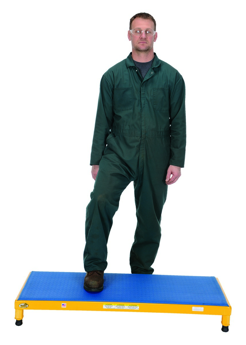 Steel Adjustable Work-Mate Stand 48 In. x 19 In. x 6-3/4 In. 500 Lb. Capacity YellowThe adjustable work-mate stand minimizes fatigue by elevating workers to heights that are comfortable and ergonomically correct. Especially useful when multiple shift employees operate the same piece of machinery. The ergonomic matting deck style provides comfort for the operator who stands all day. The height of each leg can be adjusted individually to ensure proper working height.