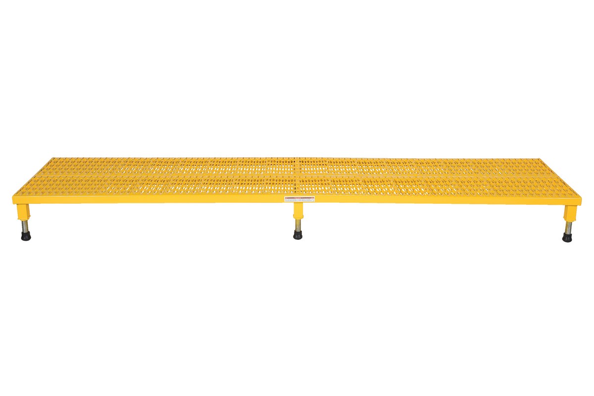 Steel Adjustable Work-Mate Stand 97 In. x 23-1/2 In. x 6-3/4 In. 500 Lb. Capacity YellowThe adjustable work-mate stand minimizes fatigue by elevating workers to heights that are comfortable and ergonomically correct. Especially useful when multiple shift employees operate the same piece of machinery. The height of each leg can be adjusted individually to ensure proper working height.