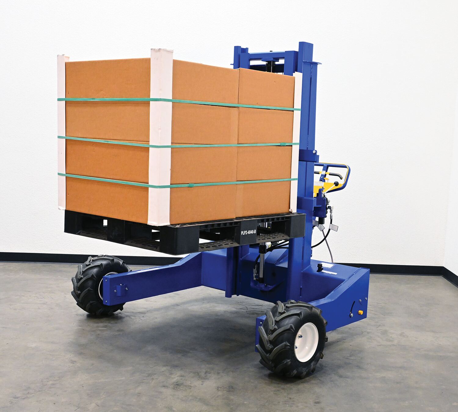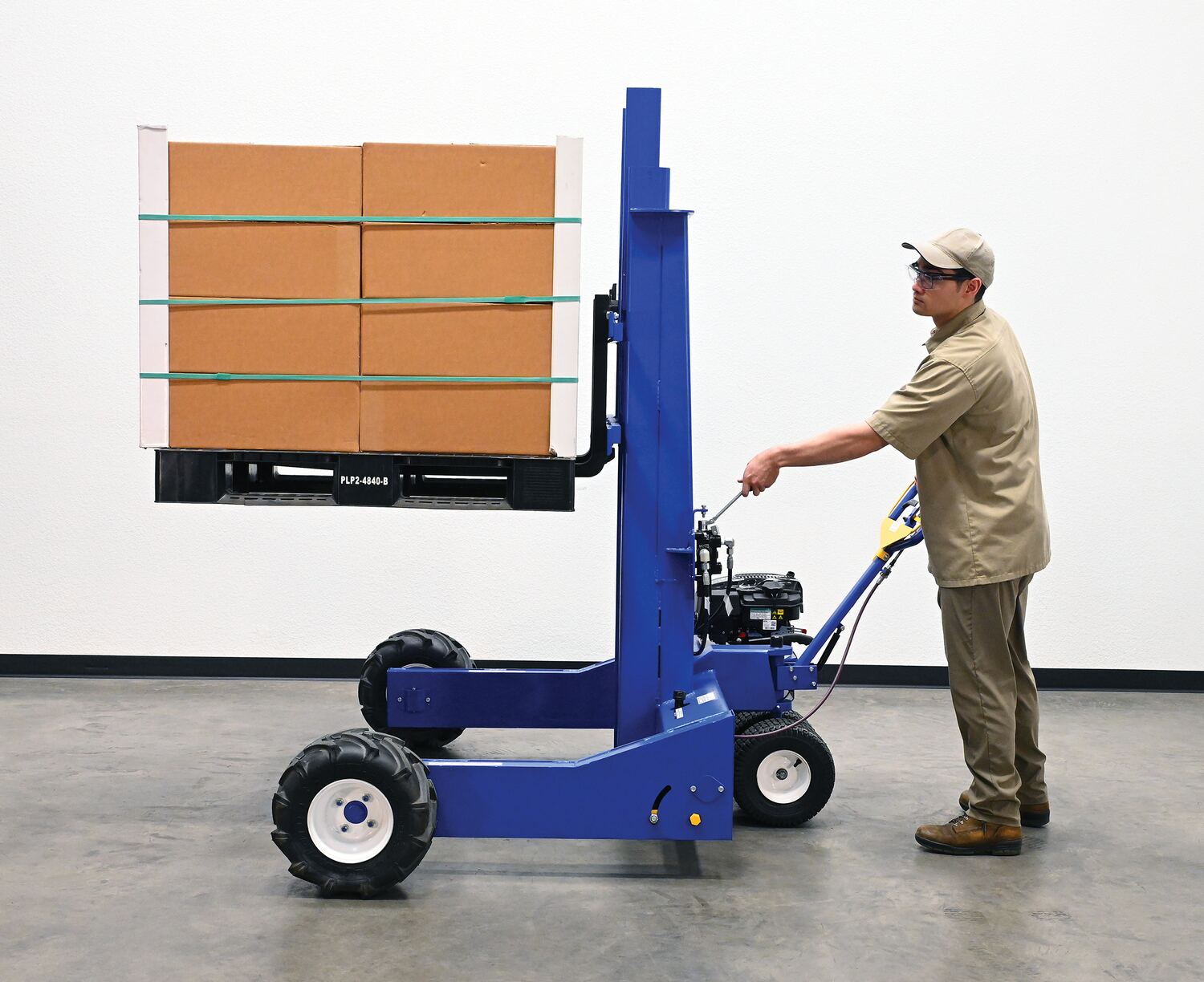 All terrain pallet truck with gas-powered traction drive system. Great for moving heavy loads over rough terrain. Powered by a Briggs & Stratton 6HP gas-powered engine for both the power traction drive and fork lift/lower. Handle with forward reverse speed control and dead man safety switch. Approximate walking speed is 3 mph. Hydrostatic transmission with hand-operated forward and reverse selection. Powered fork raise and lower control lever. Usable width between outriggers is 52". Pneumatic steer wheels are 13" diameter x 4" wide each. Wheels include sealed bearings for outdoor use. Comply with ASME B56.1-2004.