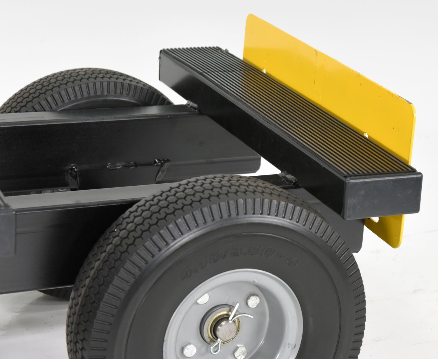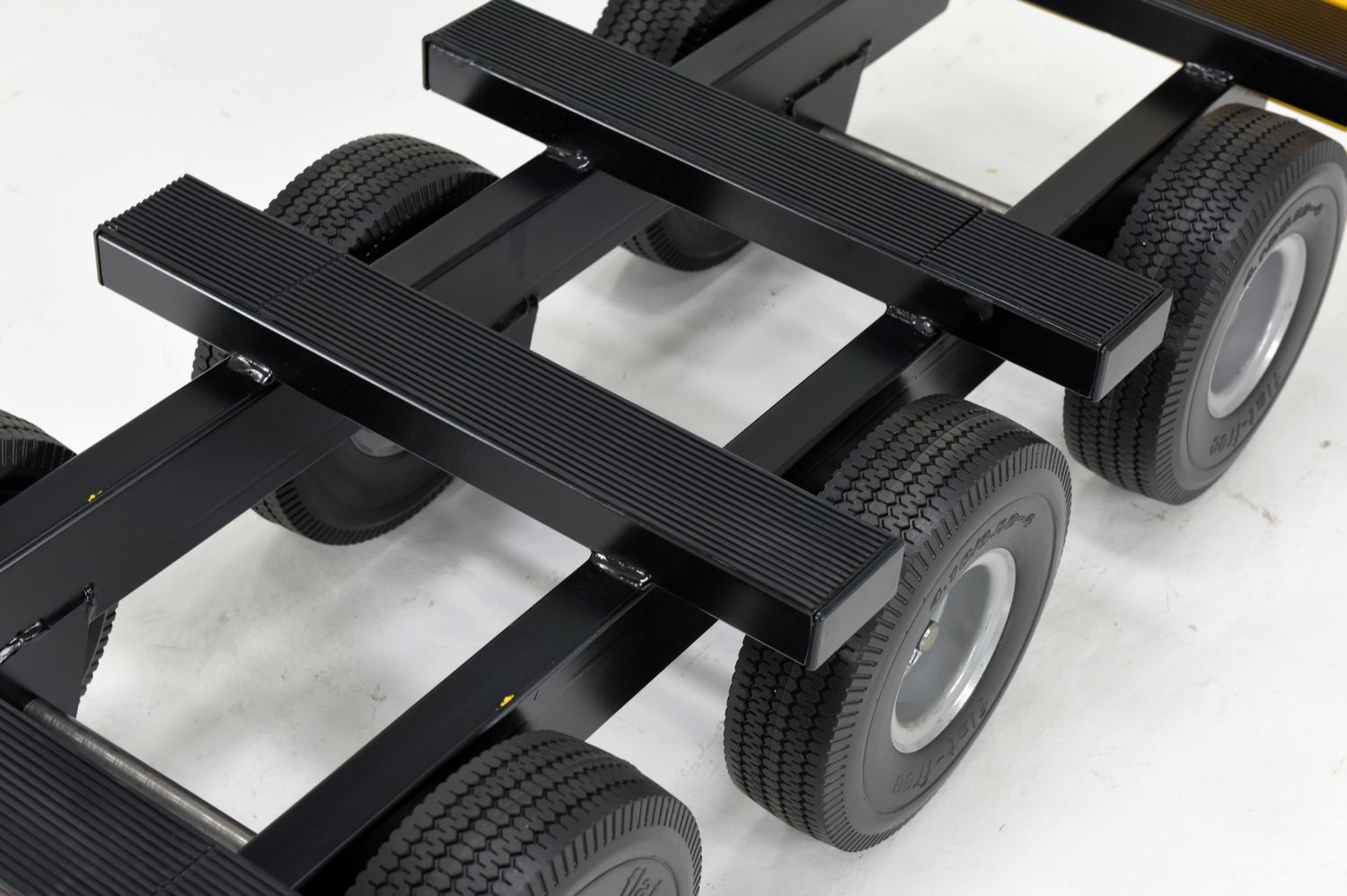 A six wheel dolly can be a major benefit in many conditions. The large oversized wheels give the unit, and any material on board, a smooth vessel to move goods in between areas. Yellow adjustable plate fitted to the rear of the unit. The plate acts as a barrier for items that fit snuggly on the dolly. When the plate is down, it makes room for any oversized products that are too long to fit perfectly square onto the platforms of the dolly. The front of the dolly is an open design that makes it easy to secure any sort of pulling device that may be used. Also included is a strap that can be used to pull the unit, by mechanical or manual means.