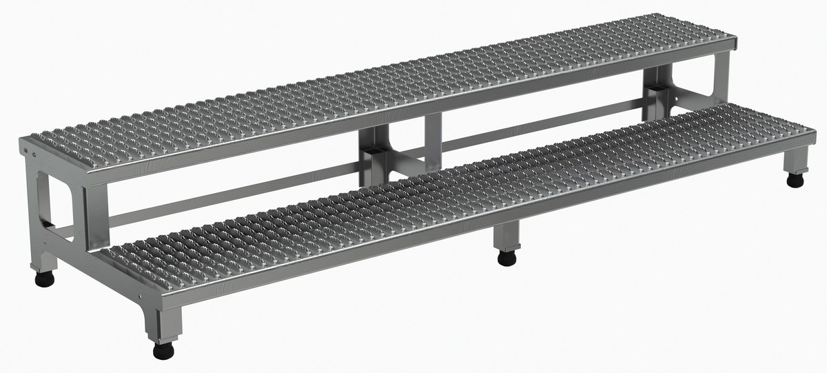 The adjustable step-mate stand can be used as either a comfortable worker platform or a semi-permanent step. The serrated surface ensures safe footing. The legs adjust individually by screwing them into or out of the leg base.