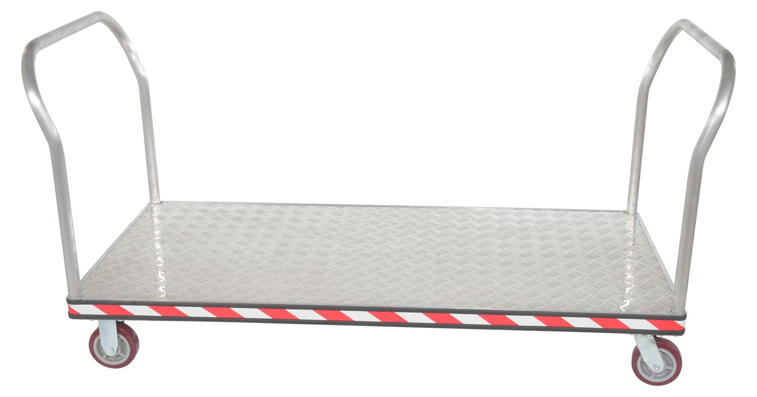 Aluminum Heavy Duty Dual Handle Tread Plate Platform Truck 30 In. x 72 In. 3600 Lb. Capacity SilverAn aluminum tread plate platform truck is a great addition a variety of settings. Fitted with non-marking rubber protective buffer strip to protect walls and door frames during transit. Design allows items to be loaded and unloaded from multiple sides. The poly-on-poly casters roll smoothly over surfaces.