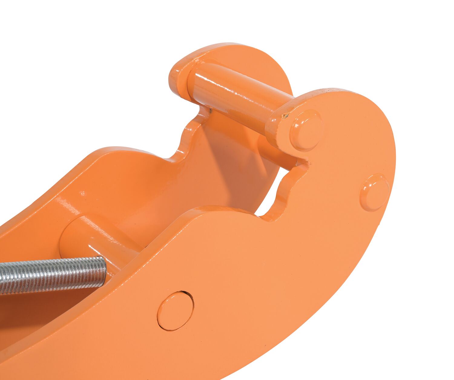 Steel Beam Clamp Horizontal Lift Style 21-1/4 In. x 5-1/4 In. x 7-3/4 In. 10000 Lb. Capacity OrangeThe beam clamp is designed to reduce the I-beam flange stress by distributing loads away from the flange edges during overhead lifting applications. This versatile unit can be interchanged from one gantry to another in a matter of seconds. A bar is located at the bottom of the beam clamp for attaching a hoist (sold separately). Painted finish.