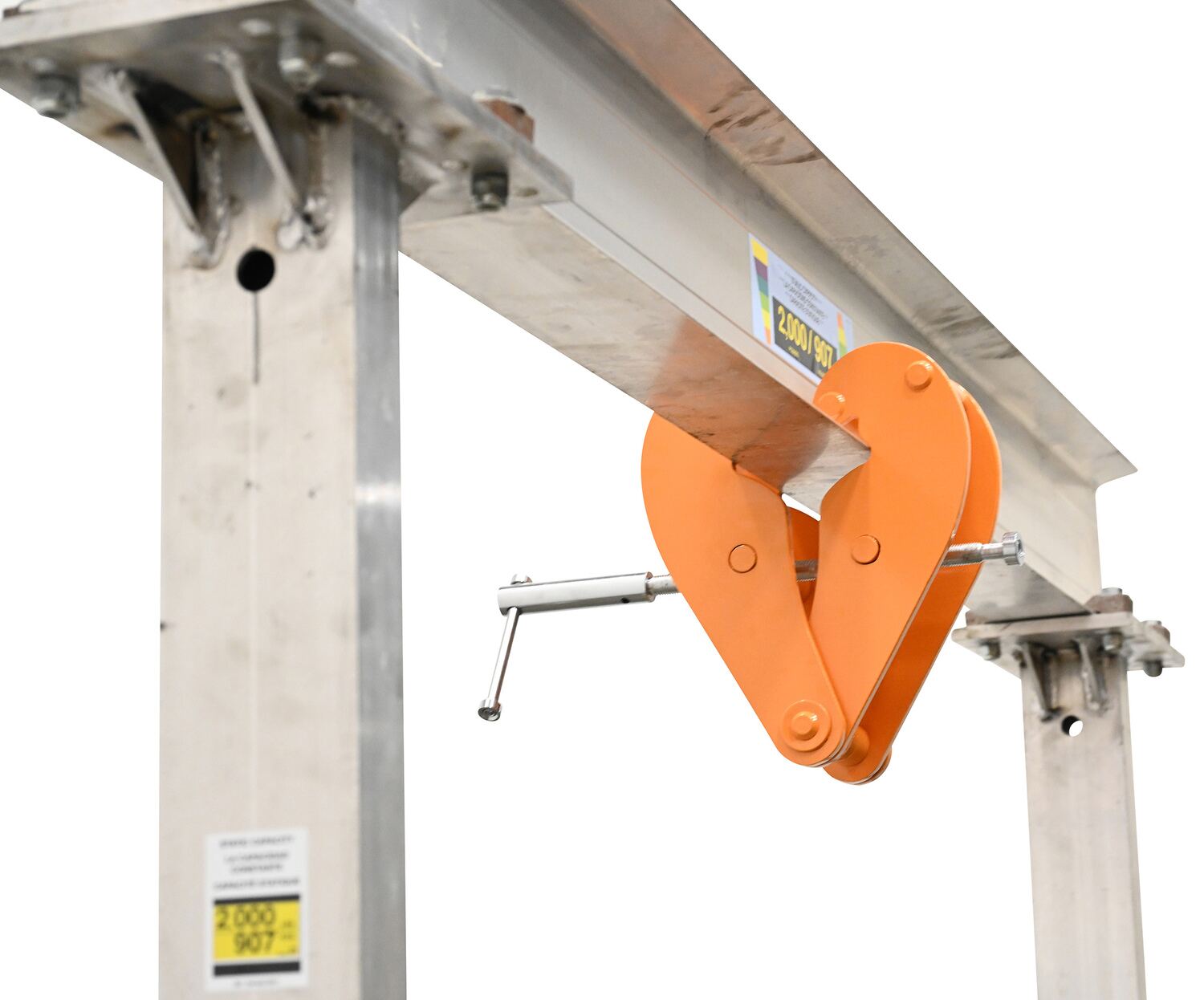 The beam clamp is designed to reduce the I-beam flange stress by distributing loads away from the flange edges during overhead lifting applications. This versatile unit can be interchanged from one gantry to another in a matter of seconds. A bar is located at the bottom of the beam clamp for attaching a hoist (sold separately). Painted finish.