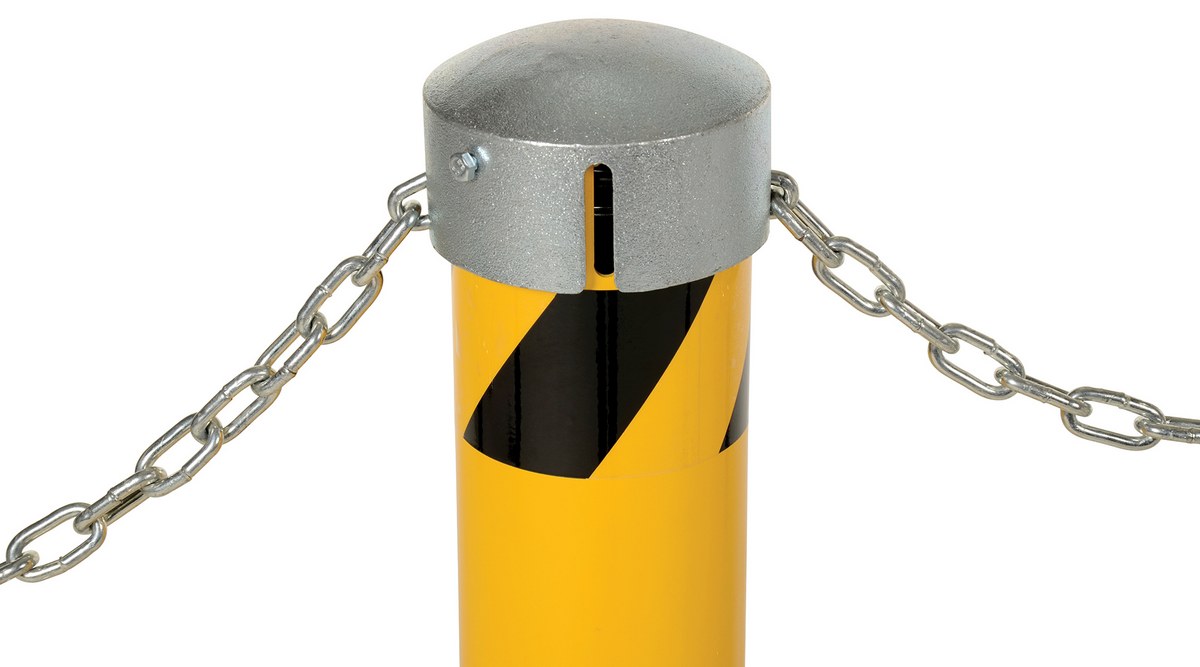 Create barriers around workstations, machinery, and outdoor space with steel pipe bollard with chain slots. Ideal for indoor and outdoor applications. Easy to assemble. Removable bolt-on steel top cap with socket set-screw. Place chain into chain slots, storing any excess chain inside the bollard, and place cap back onto bollard. The chain slots hold chain connected to other bollards. Base plate includes pre-drilled bollard. Heavy duty welded steel construction. Powder coat safety yellow finish.