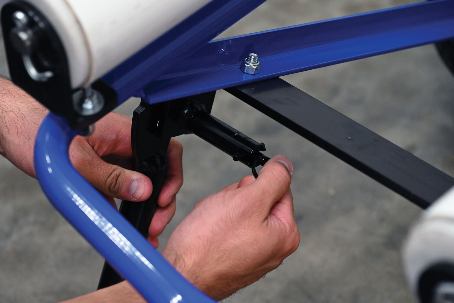 This portable carpet dispenser minimizes lifting and pulling. Slide carpet onto rollers. Carpet unrolls as needed. Retractable legs stabilize the cart. Welded steel construction with powder coat blue finish.