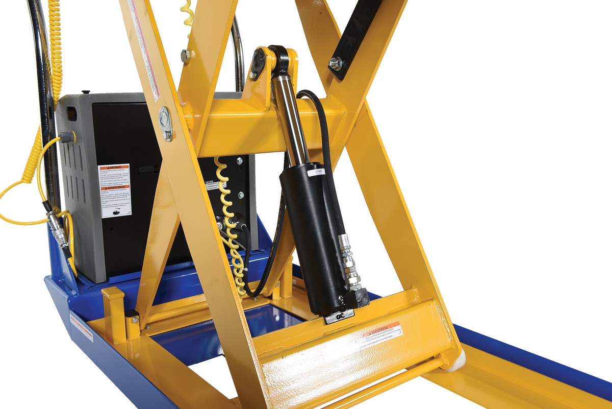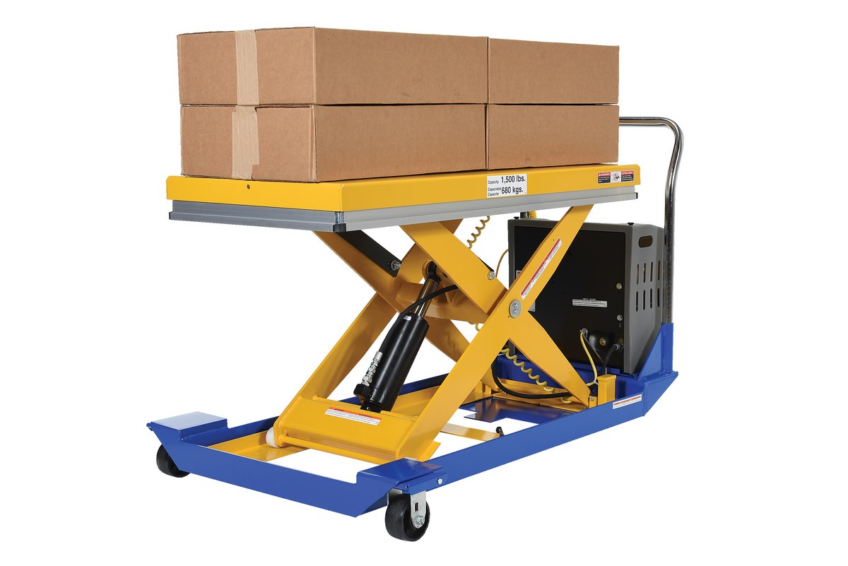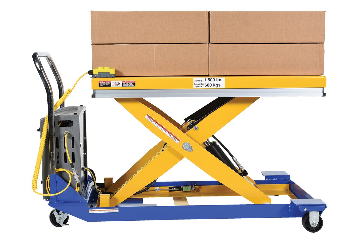 Steel DC Powered Scissor Cart 48 In. x 24 In. 1500 Lb. Capacity Blue / YellowThe DC powered Scissor Cart table provides an unparalleled support in lifting, palletizing, loading, and unloading applications. The cart is raised or lowered with a DC powered motor. The unit rolls smoothly on two rigid and two swivel phenolic casters with brakes. The internal DC powered electric motor and battery is included on DC units. The built-in battery charger is AC powered and is included. Push buttons to raise and lower lift are located on a hand control with a coil cord, which is standard. The platform is equipped with perimeter pinch-point guard for OSHA compliance. The push handle is removable. Features an internal safety velocity fuse in each cylinder.