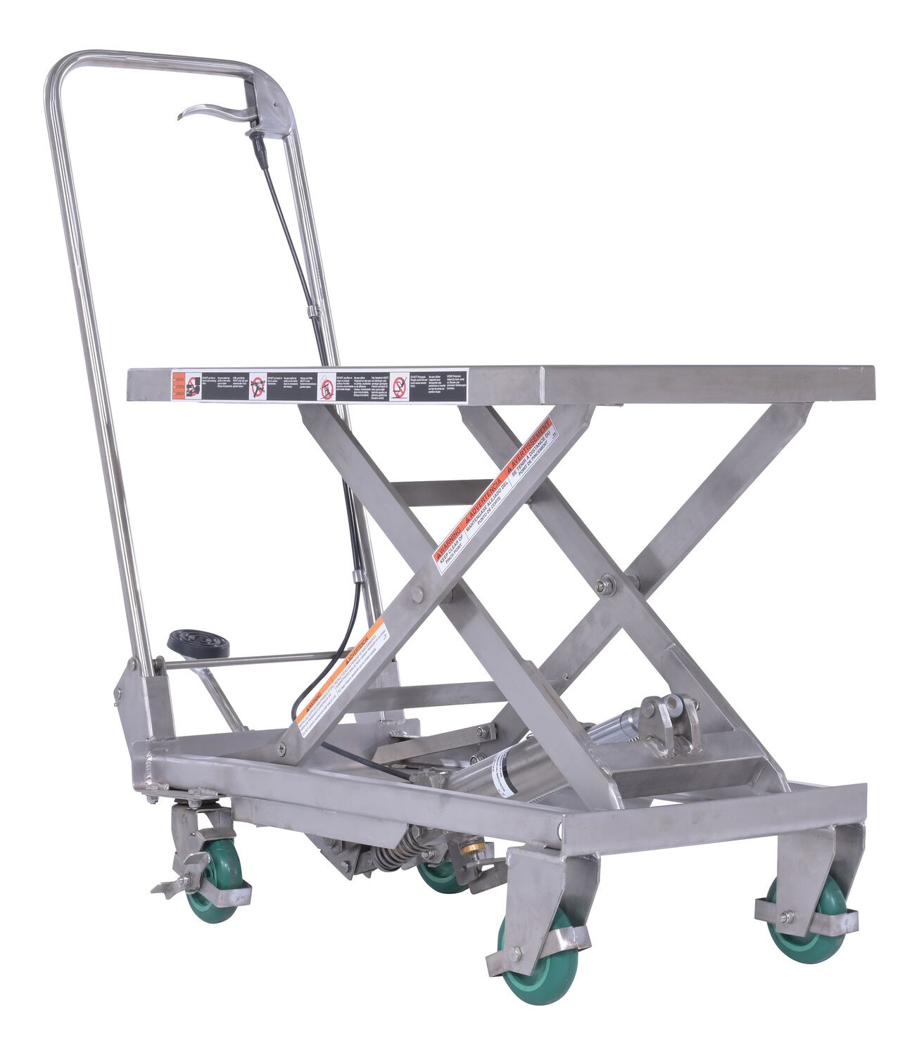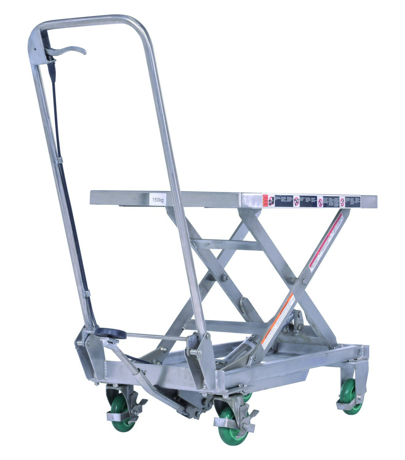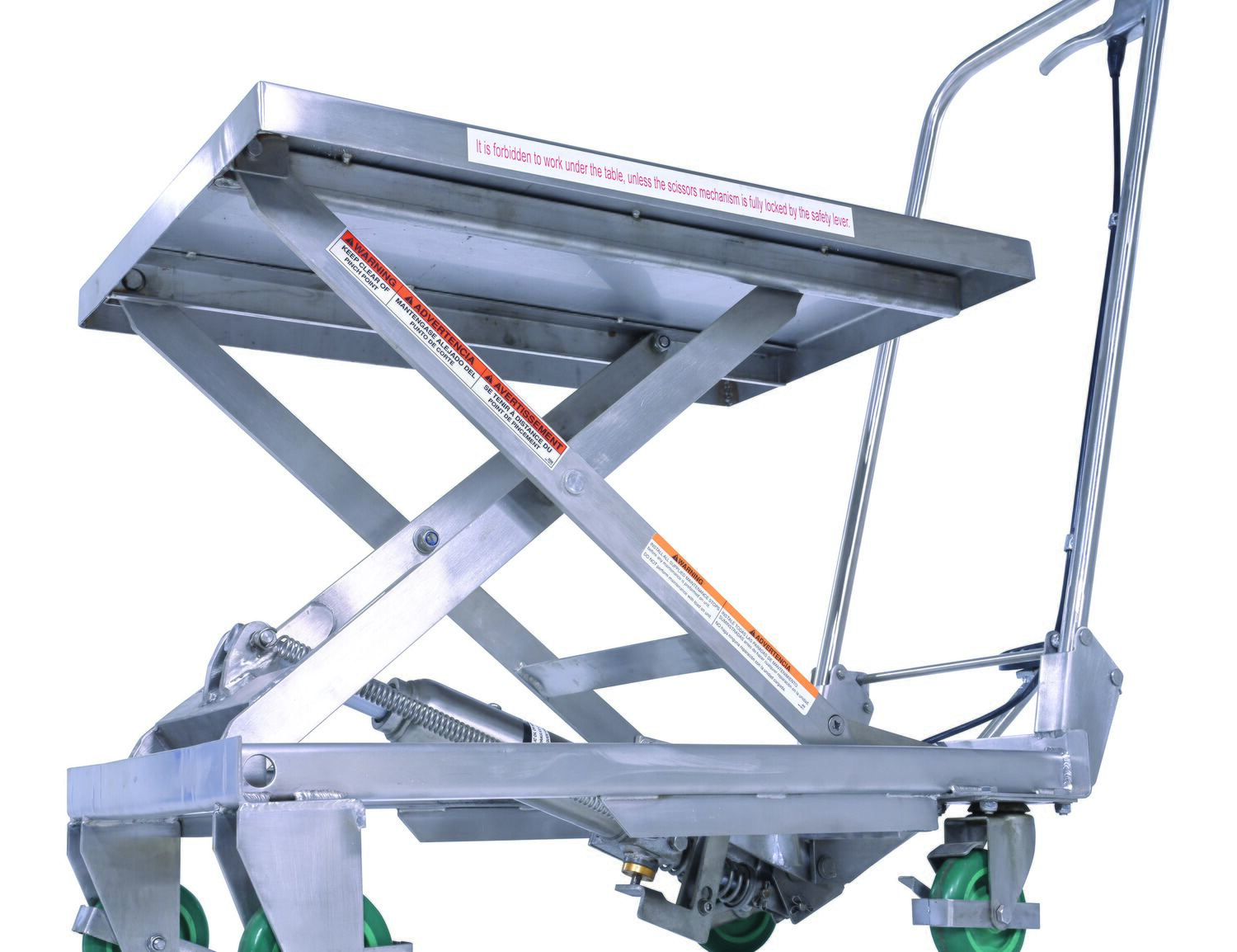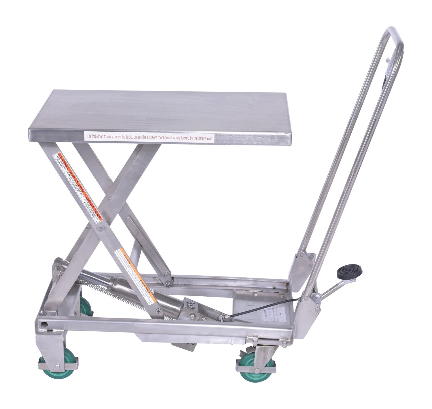 Our fully welded Stainless Steel carts are suitable for most food, medical and pharmaceutical industry settings. They are also suitable for wash-down applications. The quick manual raising and lowering lets the user adjust the height to their desired preference. While an open platform design makes for simple loading and unloading from all sides. Capacity is rated for 300 lbs.