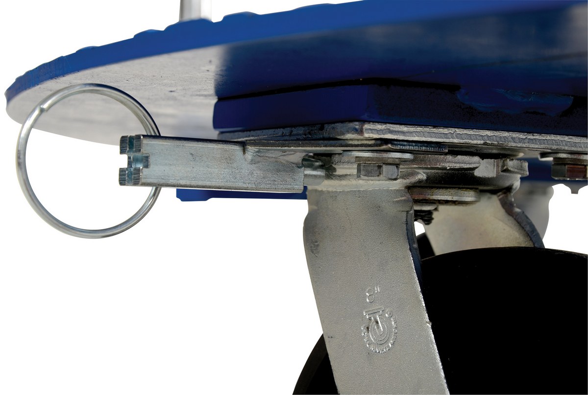 The pallet cart with carousel is used to transport products to where they are needed. Then, once at desired location, pull pin on the casters will allow the cart to manually rotate like a carousel for easy unloading and improved efficiency. The removable handle allows for full deck access from any position. Includes four glass-filled nylon swivel caster with swivel locks.