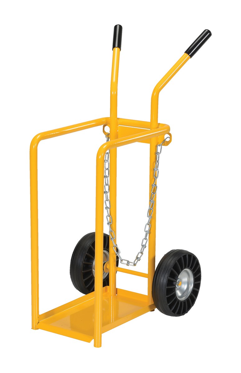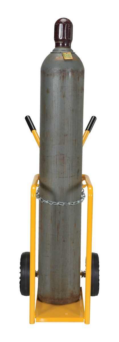 Steel Welding Cylinder Hand Truck 23-7/8 In. x 17-3/4 In. x 40-11/16 In. 150 Lb. Capacity YellowIdeal for transporting cylinders from storage to work space. Capable of handling two 9" cylinders. Chains provide utmost safety. Tilt back design for effortless transportation.
