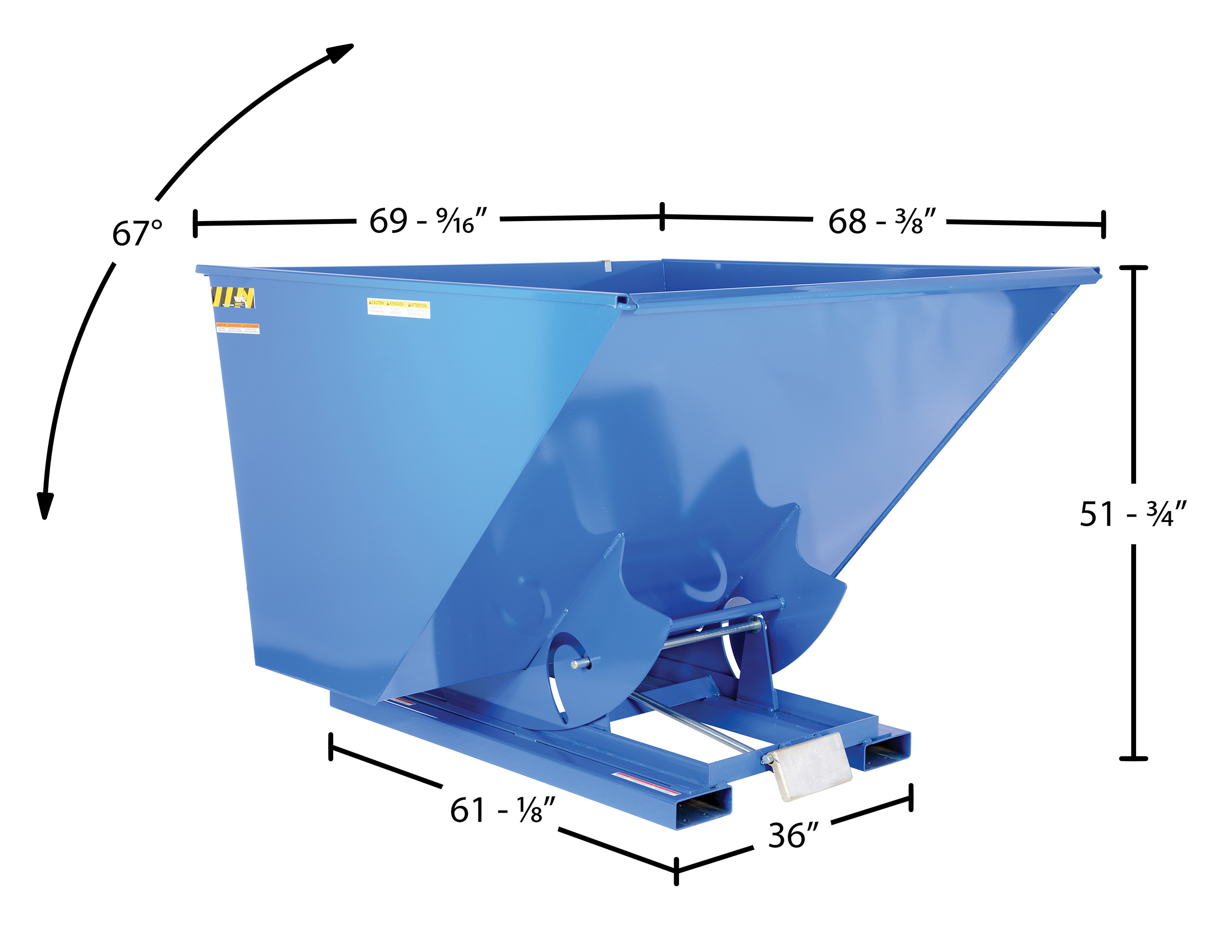 This Light Duty self-dumping steel Hopper with bumper release automatically dumps when bumper release contacts the front of the dumpster. Hopper returns to an upright and locked position automatically after it dumps. Also includes a cable that may be operated from the seat of the fork truck to manually dump the hopper. The included safety restraint should be properly secured to a fork truck before dumping. (Length dimension is measured at top of chute.) Self-dumping hoppers facilitate compliance with OSHA general industry rule 29 CFR 1910.178(m)(5)(iii) by allowing lift truck operators to remain at the controls of their truck throughout the dumping process.