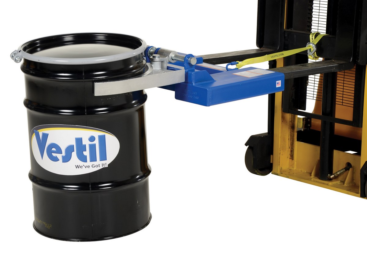 The drum gripper makes it easy to pick up one open head (with lid installed and secured) and closed head steel drum without leaving the seat of the fork truck. Simply slip the forks into the fork pocket, fasten the safety restraint and the drum gripper is ready to go. The knuckle gripping system is lowered around the drum, gripped tightly, and then lifted into the air. Drum is automatically released by lowering the forks. Features hinged folding design for storage and adjustable-width arms for use with steel drums. Safety restraint included. Welded steel construction. Powder coat finish.