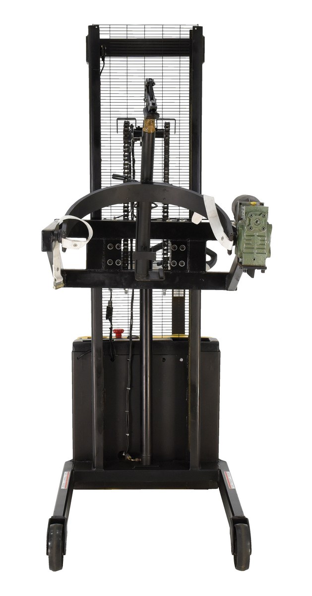 Steel DC Powered Drum Lifter/Rotator/Transporter with Scale 34-5/8 In. x 61-13/16 In. x 85-7/16 In. 550 Lb. Capacity Black/YellowA fully powered drum scale with powered drive, lift, and rotation. High torque 24V DC drive. Ergonomic handle features safety enhanced emergency remote function and horn. Includes disc brake with automatic dead-man control. Two (2) 12V lead acid batteries. Integral battery charger and level gauge. Scale head features automatic turn off and +/- 0.5 pound accuracy. Scale includes AA batteries and an AC adapter.