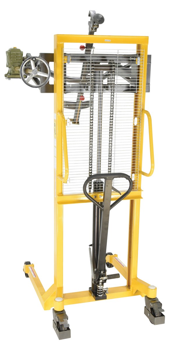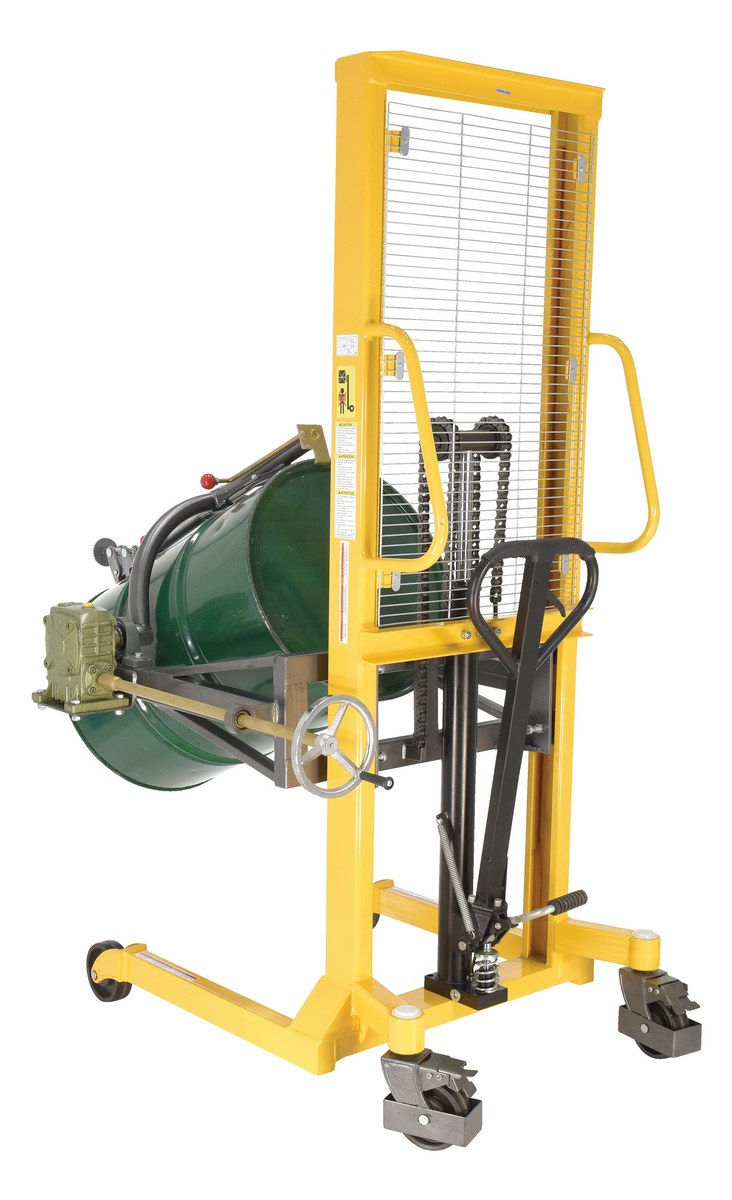 The economy portable Drum Lifter/rotator/transporter make it easy to lift, transport and tilt steel drums. Ideal for use in warehouse environments when moving drums to and from racks. Drums can be locked in a vertical position to avoid spills or a horizontal position for draining through a faucet. A manual hand crank allows the drum to tilt. Raise the drums with a manual hand or foot pump operation. This model features a steel jaw which securely grips the top lip of the drum. Complies with ANSI B56.10.