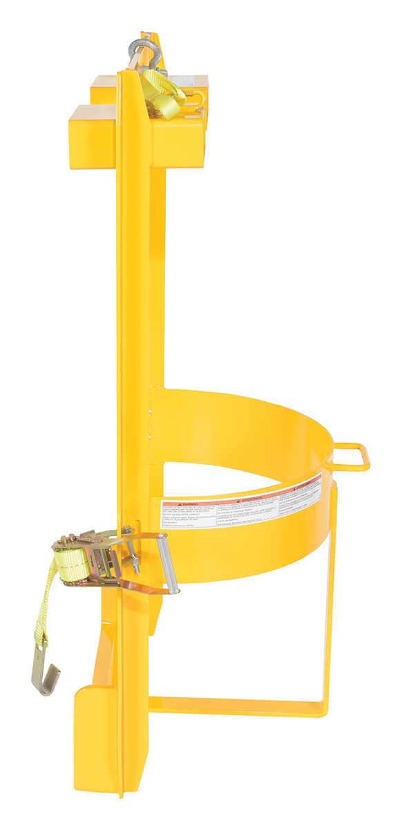 This overhead Drum Lifter is designed for lifting drums with an overhead crane or similar lifting device. Integral fork pockets are also included for transportation with forklift. Safety restraint included. Steel saddle is designed for use with steel, plastic & fiber drums with a ratchet strap for securely holding the drum in place. With a non-tilting style, this lifter is made for straight vertical lifting only. Features a durable yellow baked-in powder-coated toughness. Complies with OSHA Rule 1910.178; ANSI B56.1; ASME B30.20.
