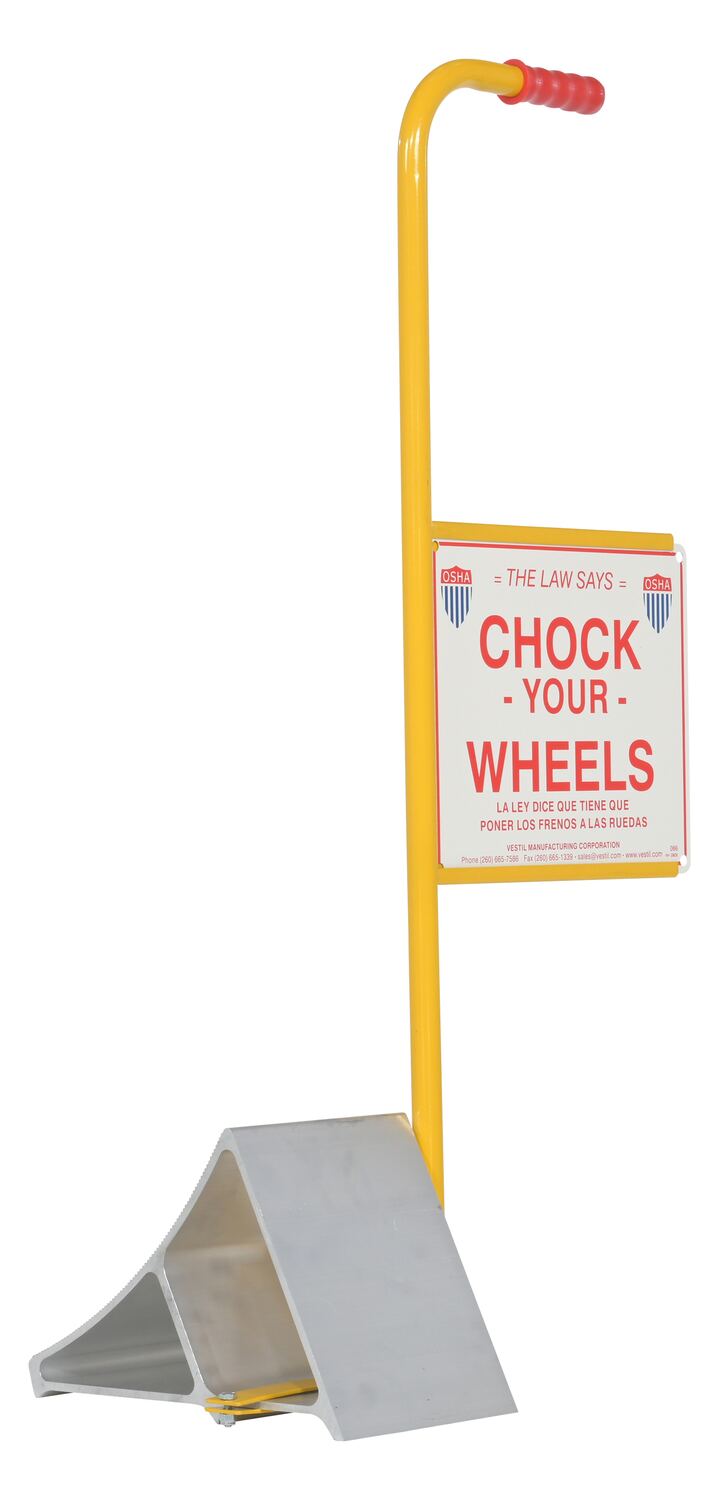 Aluminum Wheel Chock with Handle and Sign 7-11/16 In. x 20-11/16 In. x 37-1/16 In. Silver/YellowThe aluminum wheel chock is ideal for maintenance and industrial facilities. The chock is constructed of extruded lightweight aluminum that is easy to handle. The unit features a serrated top to grip the tire and a triple edged bottom to grip the ground. An extended handle with safety sign is included.