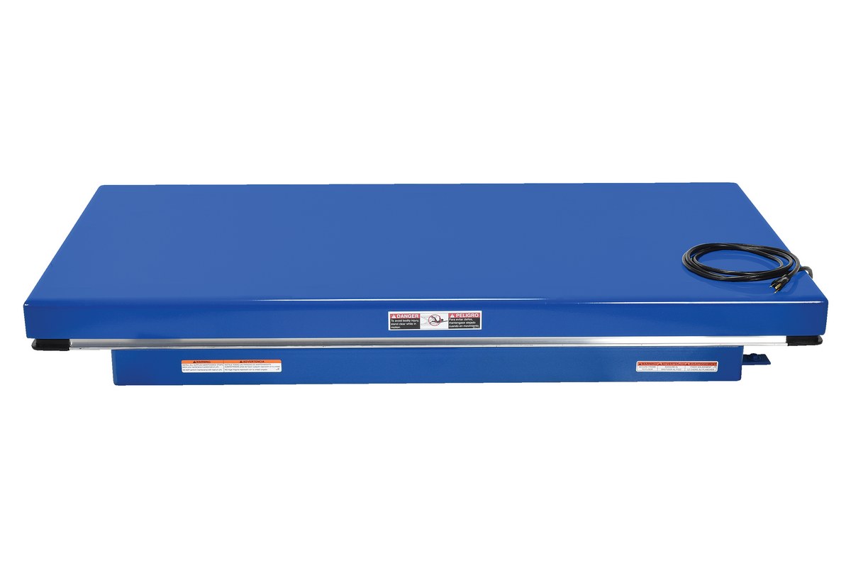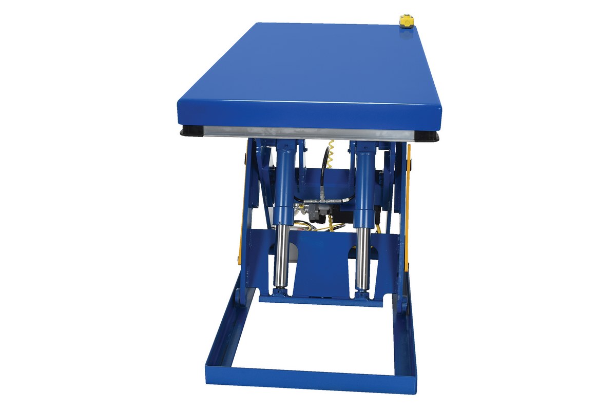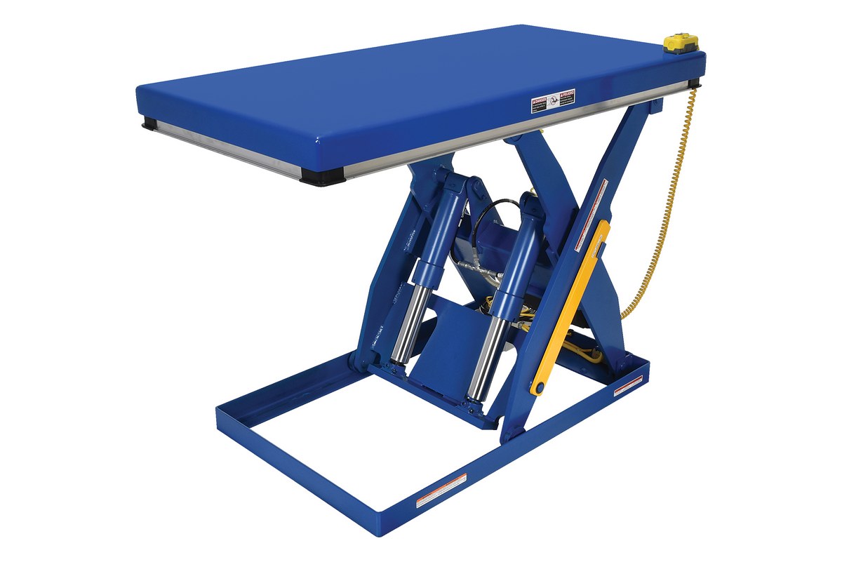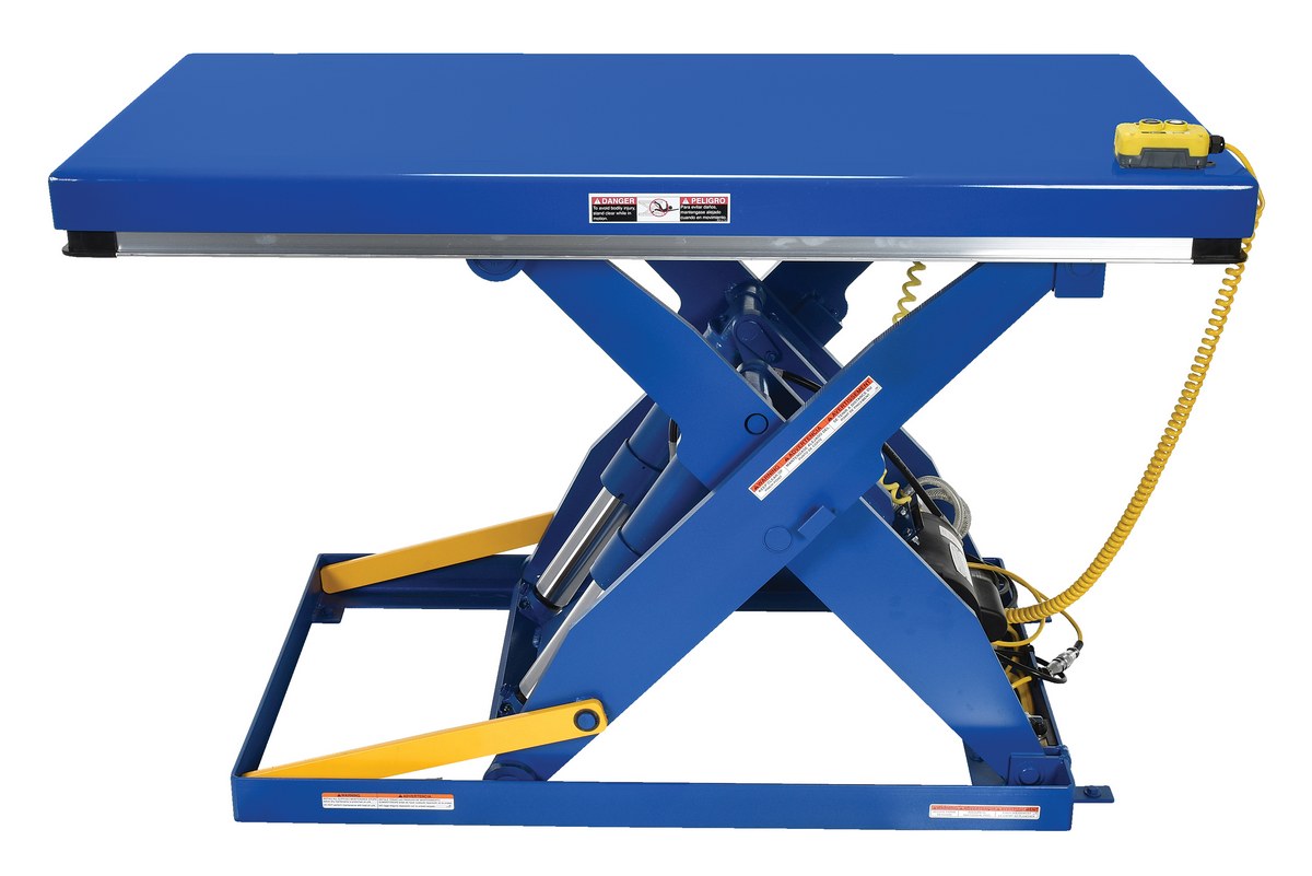 Steel Electric Hydraulic Lift Table 24 In. x 48 In. 4000 Lb. Capacity BlueThe electric hydraulic scissor lift table is used by all types of manufacturing and warehouse facilities. Safety features include a patented pinch point perimeter toe guard to protect pinch points while lowering the table, fused push button control, internal safety velocity fuse to maintain platform height in the event of hose or fitting failure, integral maintenance prop, adjustable upper travel limit switch to stop the table at maximum height, and displacement-style hydraulic cylinders for maximum strength. It also features a pressure plated pump, manifold system, and state-of-the-art lifetime lubricated bearings. The standard 56 frame electric motor is fully enclosed with additional voltage options available. Contact factory if platform dimensions are crucial.