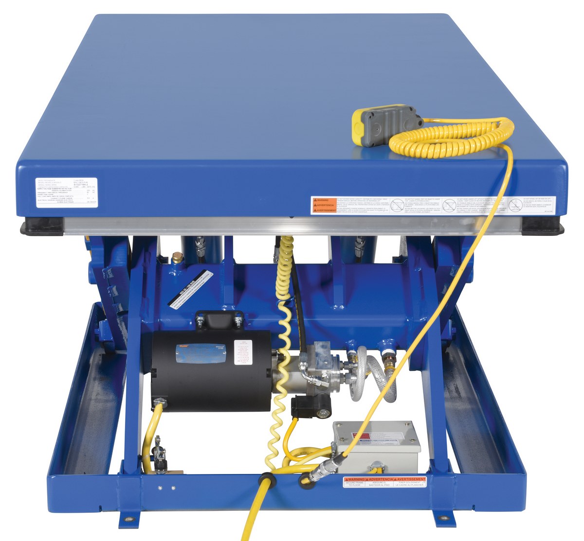 Steel Electric Hydraulic Lift Table 36 In. x 72 In. 5000 Lb. Capacity BlueThe electric hydraulic scissor lift table is used by all types of manufacturing and warehouse facilities. Safety features include a patented pinch point perimeter toe guard to protect pinch points while lowering the table, fused push button control, internal safety velocity fuse to maintain platform height in the event of hose or fitting failure, integral maintenance prop, adjustable upper travel limit switch to stop the table at maximum height, and displacement-style hydraulic cylinders for maximum strength. It also features a pressure plated pump, manifold system, and state-of-the-art lifetime lubricated bearings. The standard 56 frame electric motor is fully enclosed with additional voltage options available. Contact factory if platform dimensions are crucial.