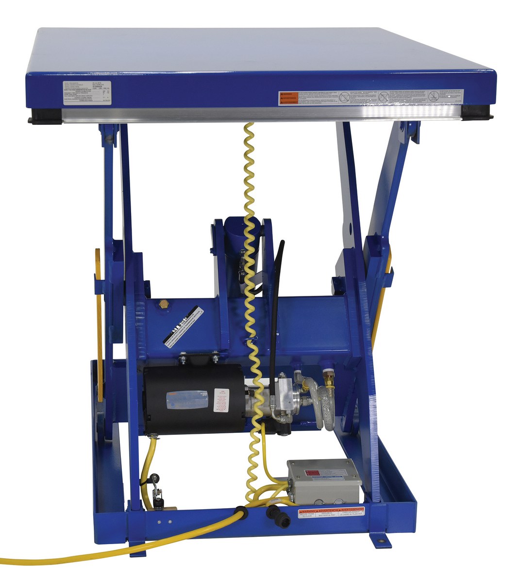 The electric hydraulic scissor lift table is used by all types of manufacturing and warehouse facilities. Safety features include a patented pinch point perimeter toe guard to protect pinch points while lowering the table, fused push button control, internal safety velocity fuse to maintain platform height in the event of hose or fitting failure, integral maintenance prop, adjustable upper travel limit switch to stop the table at maximum height, and displacement-style hydraulic cylinders for maximum strength. It also features a pressure plated pump, manifold system, and state-of-the-art lifetime lubricated bearings. The standard 56 frame electric motor is fully enclosed with additional voltage options available. Contact factory if platform dimensions are crucial.
