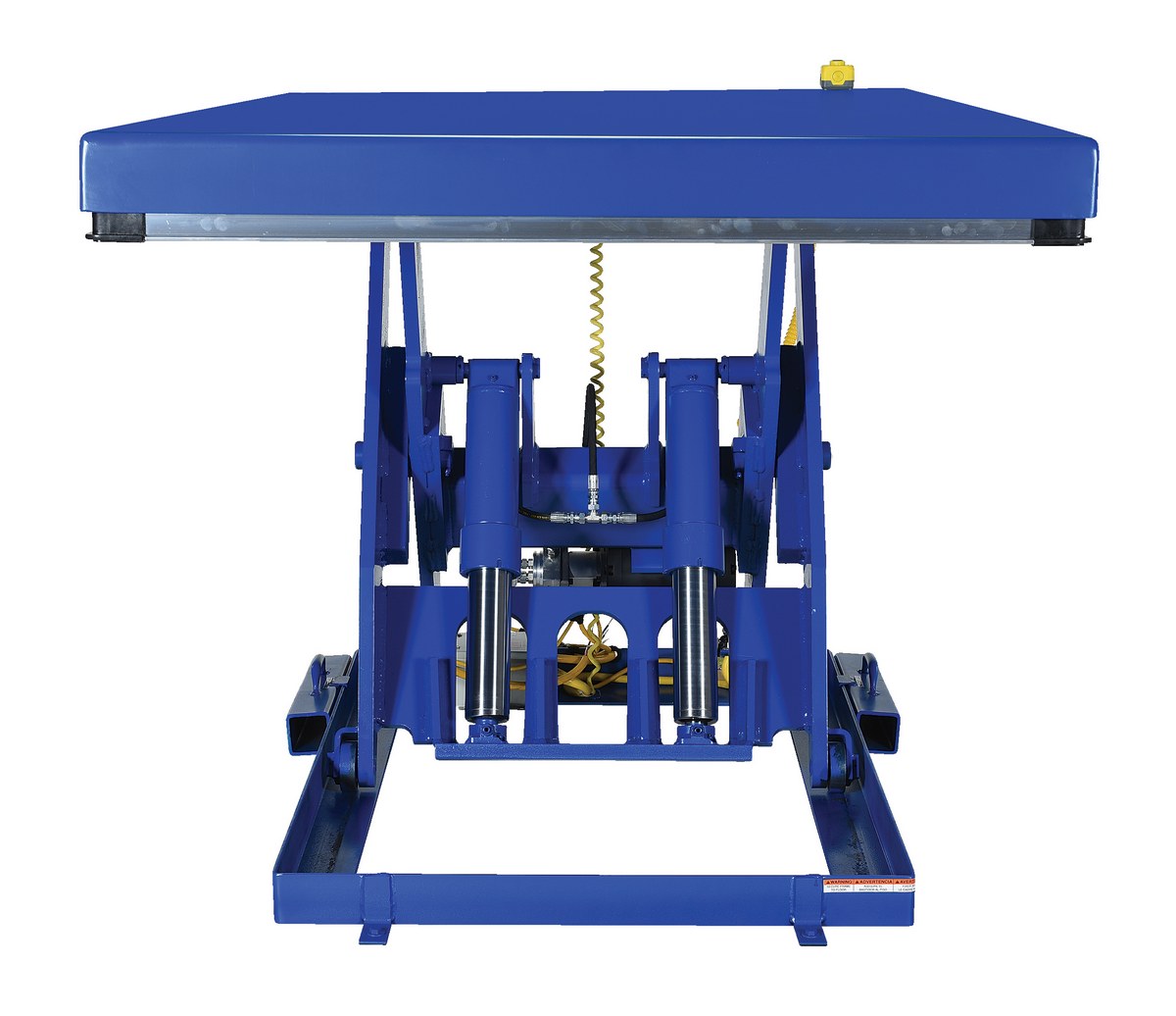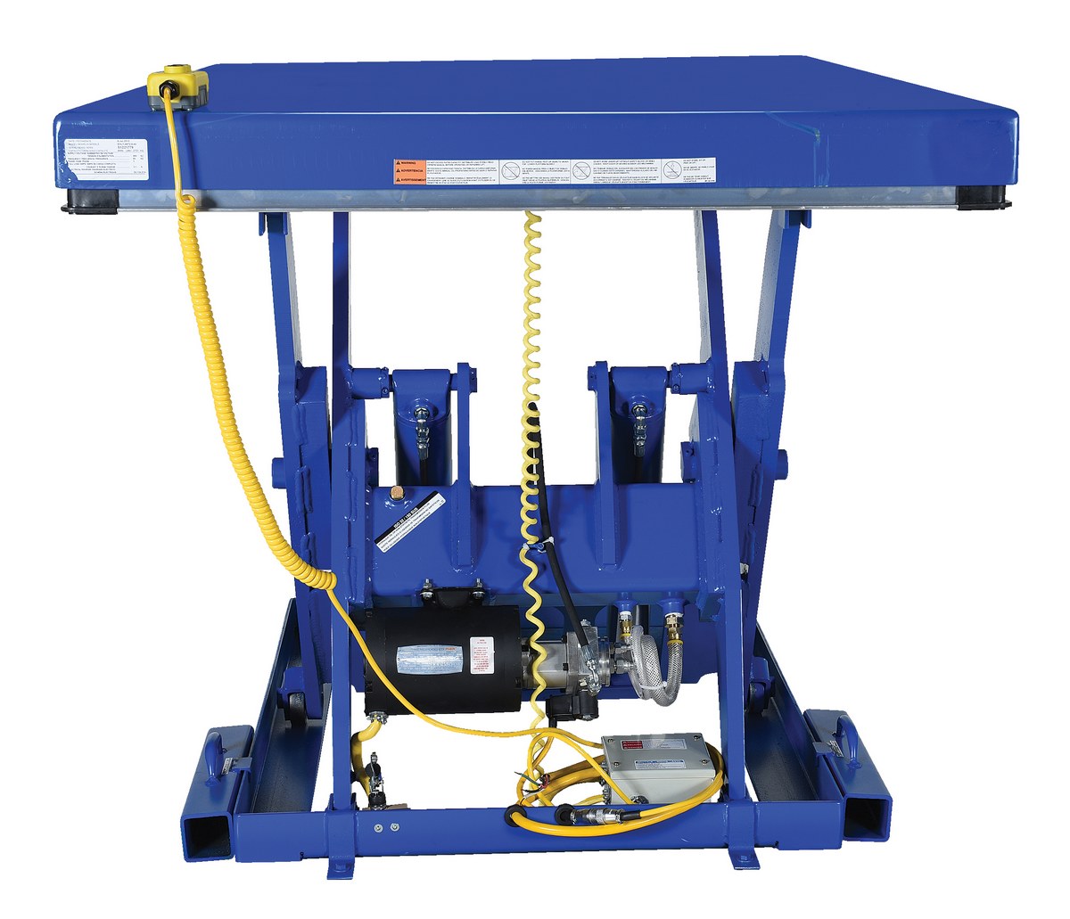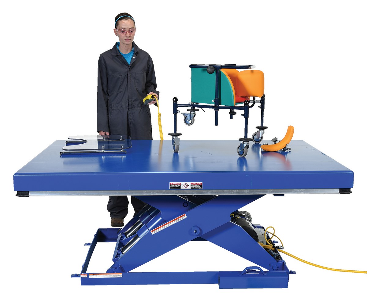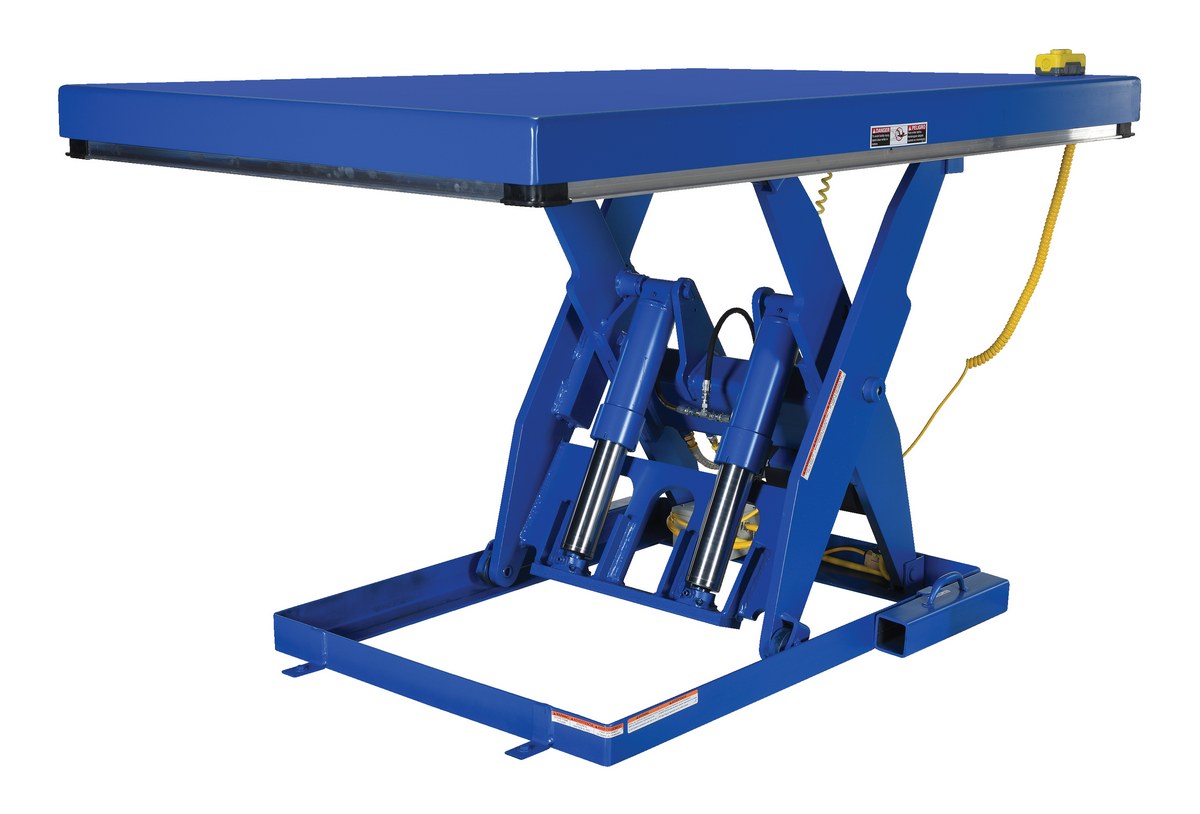 The electric hydraulic scissor lift table is used by all types of manufacturing and warehouse facilities. Safety features include a patented pinch point perimeter toe guard to protect pinch points while lowering the table, fused push button control, internal safety velocity fuse to maintain platform height in the event of hose or fitting failure, integral maintenance prop, adjustable upper travel limit switch to stop the table at maximum height, and displacement-style hydraulic cylinders for maximum strength. It also features a pressure plated pump, manifold system, and state-of-the-art lifetime lubricated bearings. The standard 56 frame electric motor is fully enclosed with additional voltage options available. Contact factory if platform dimensions are crucial.