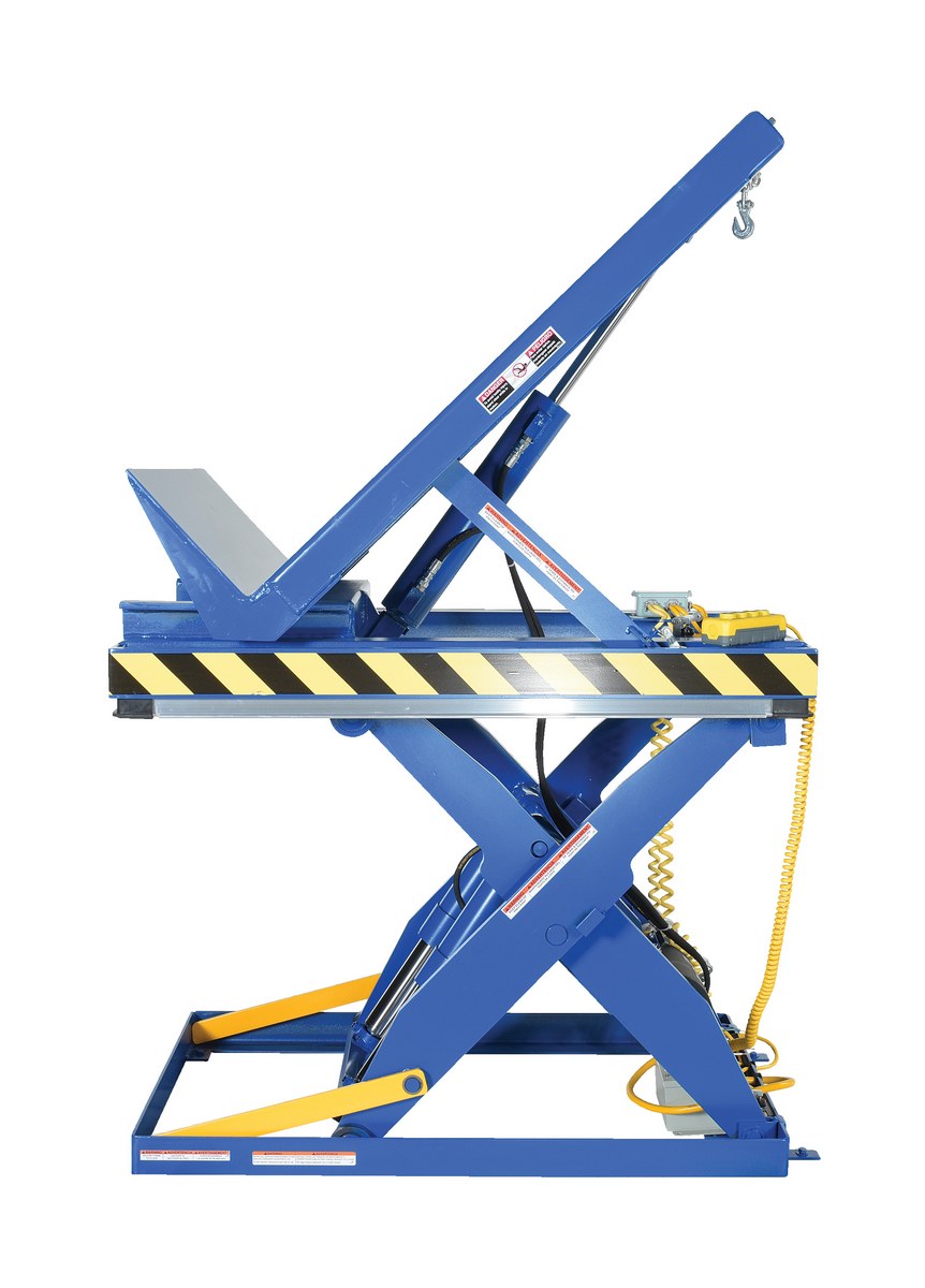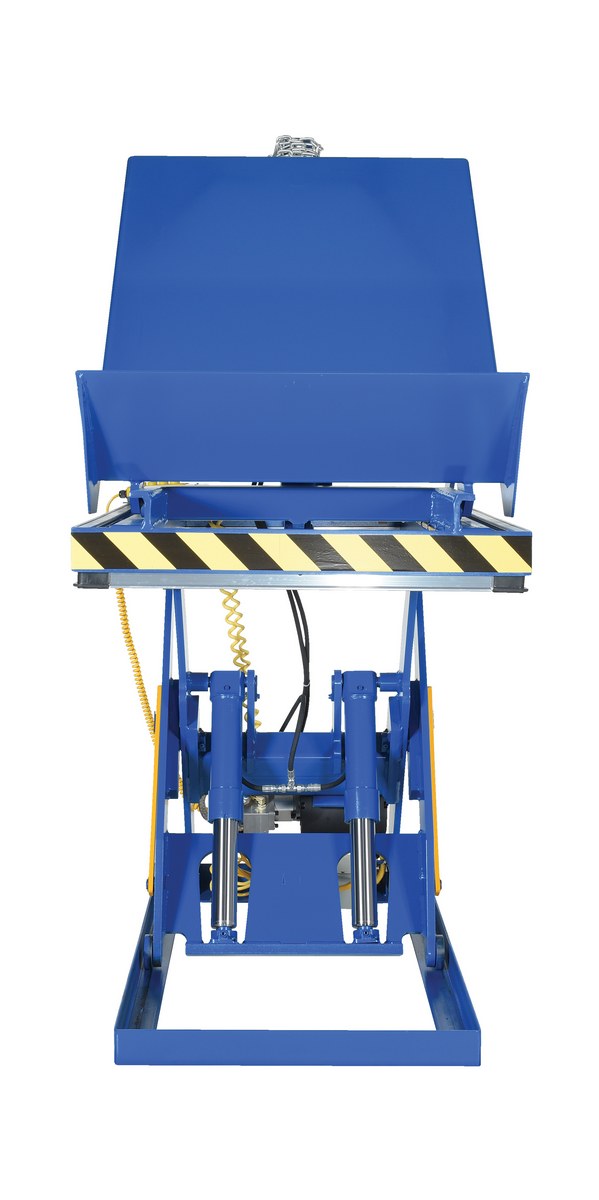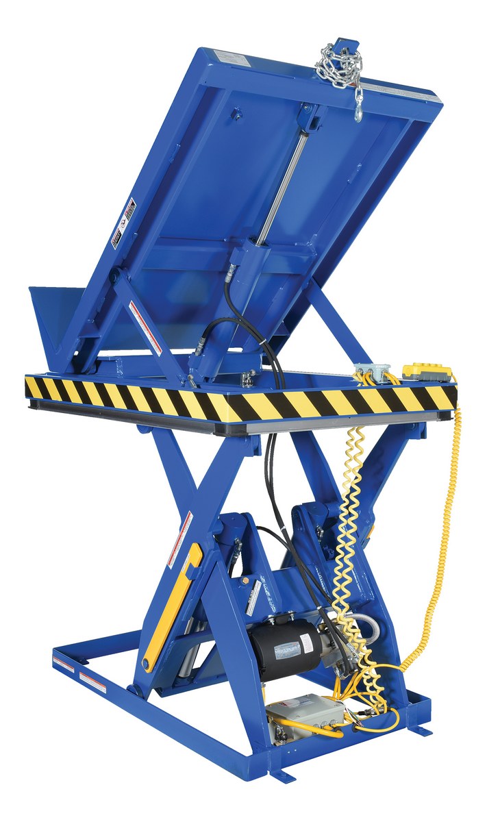 The lift and tilt scissor lift performs both lifting and tilting operations. There is a restraining chain and lip to keep the load in place during tilting. Safety features include an electric toe guard to protect workers from pinch points during lowering of table, velocity fuses to hold platform position in the event of a hose or fitting failure, four (4) push-button hand pendent control, upper limit switch to stop travel at maximum height reducing motor wear, and maintenance prop. The end tilt is standard with a side tilt available. There is optional accordion skirting available for both the lifting and tilting portions of the table.