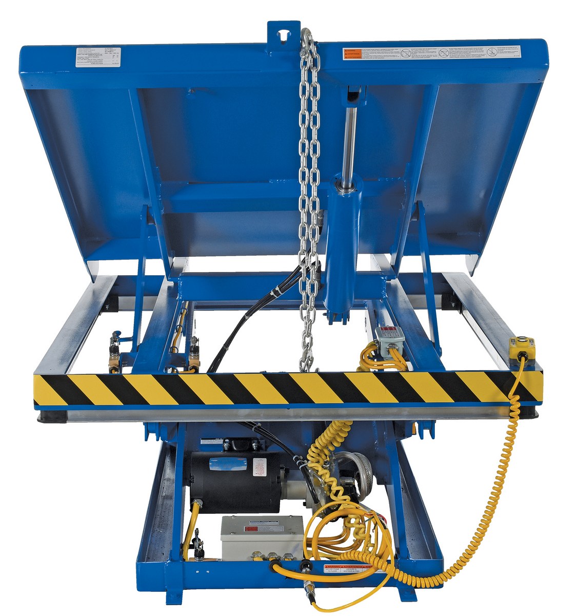 Steel Lift and End Tilt Scissor Table 48 In. x 48 In. 3000 Lb. Capacity BlueThe lift and tilt scissor lift performs both lifting and tilting operations. There is a restraining chain and lip to keep the load in place during tilting. Safety features include an electric toe guard to protect workers from pinch points during lowering of the table, velocity fuses to hold platform position in the event of a hose or fitting failure, four (4) push-button hand pendent control, upper limit switch to stop travel at maximum height and reduce motor wear, and maintenance prop. The end tilt is standard with a side tilt available. There is optional accordion skirting available for both the lifting and tilting portions of the table.