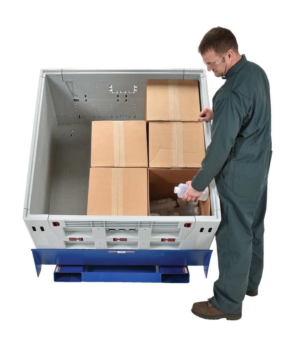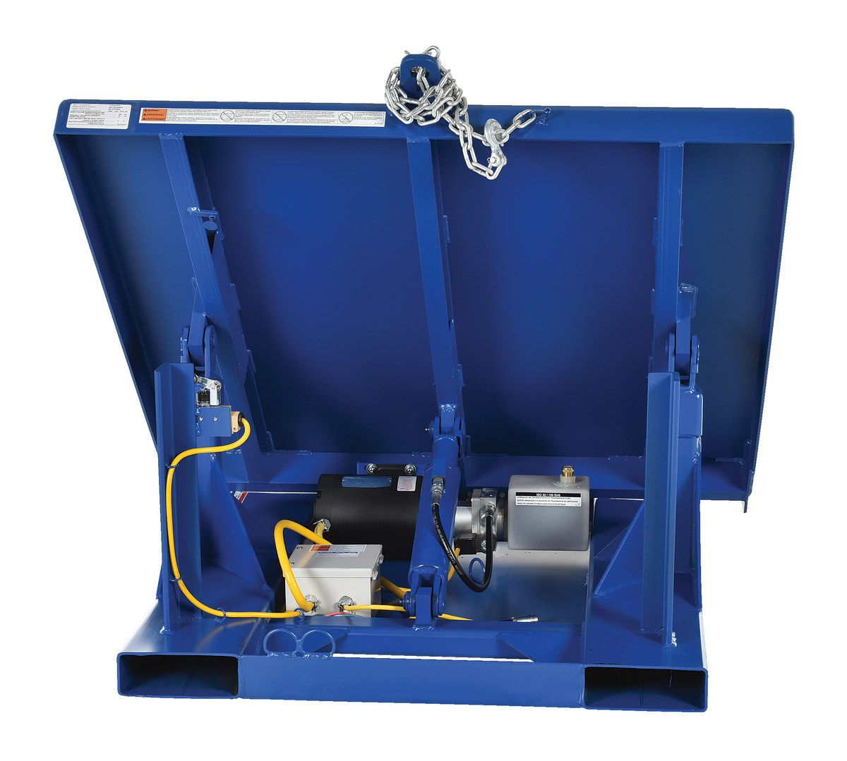 Steel Efficiency Master Tilt Table 48 In. x 48 In. 4000 Lb. Capacity BlueThe efficiency master tilt table tilts pallets, crates, boxes, or baskets to facilitate easy container loading or unloading. The table features all welded steel construction for years of durability. The unique design minimizes pinch points to meet OSHA requirements. This tilt table is equipped with an industrial quality motor that delivers the best torque with minimal amperage draw for maximum life. Standard voltage is 460/3PH, with additional voltage options available. The tilt table has a standard push button hand control. Base includes fork pockets for portability with forklift.