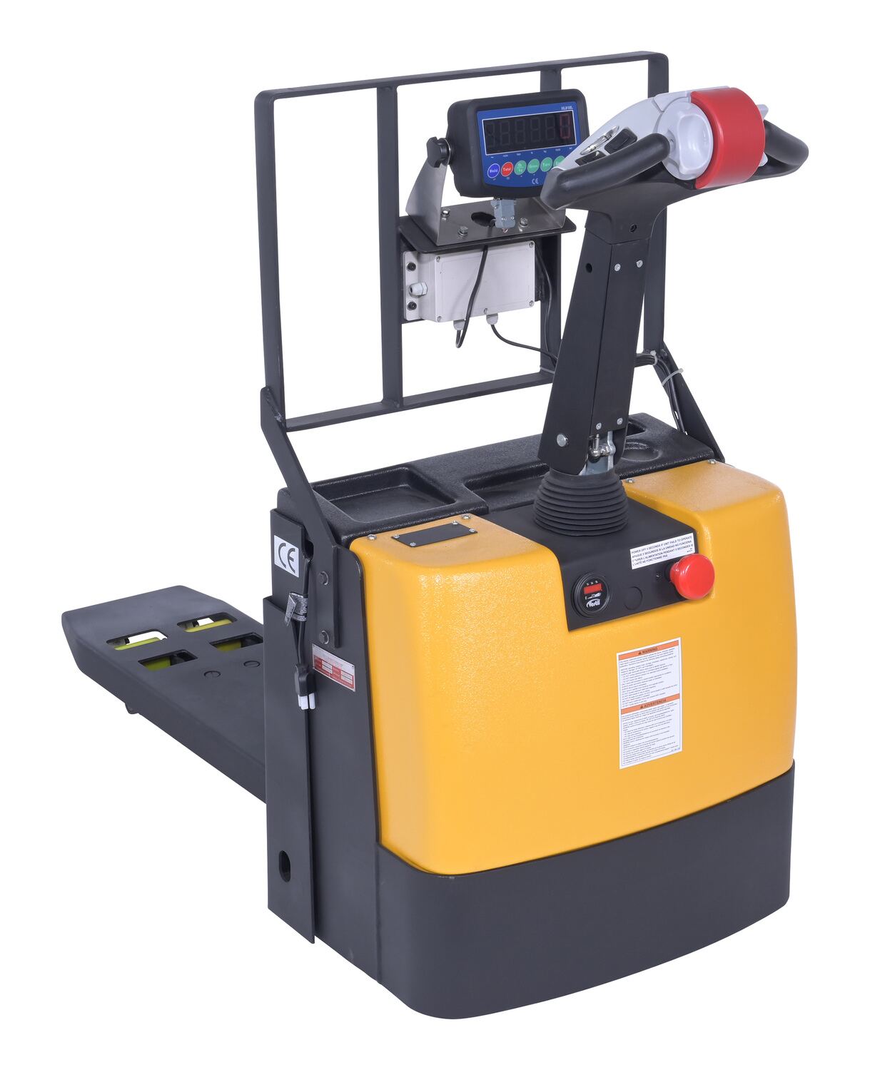 Steel Electric Pallet Truck Single Fork 40 In. Length With Scale 2,600 Lb. Capacity BlackThere are jobs where a standard electric pallet truck will suffice, but sometimes the job requires something unique. With the single fork electric pallet truck that requirement is fulfilled. The one fork design enables users to pick up and transfer items with a single fork pocket that would previously be difficult to maneuver such as half size pallets or bulk containers. With a walk behind set-up, the controls are organized in an accessible central location on or near the driving handle. This unit is battery operated for consistent steady use. (2) 12V AGM batteries standard. Powder-coated finish for baked in added toughness.