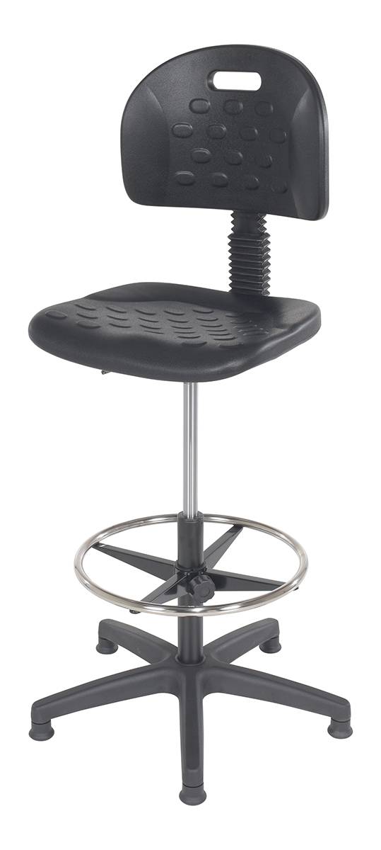 An Ergonomic work chair is a wonderful asset for workstations across a variety of commercial environments. With a polyurethane material and steel construction, the stool is comfortable and easy to clean. The height adjustment feature gives the user the ability to lower or raise the chair to the perfect position. Plastic casters are included for quick movement in the work area. Foot pads and hardware also included, assembly required.
