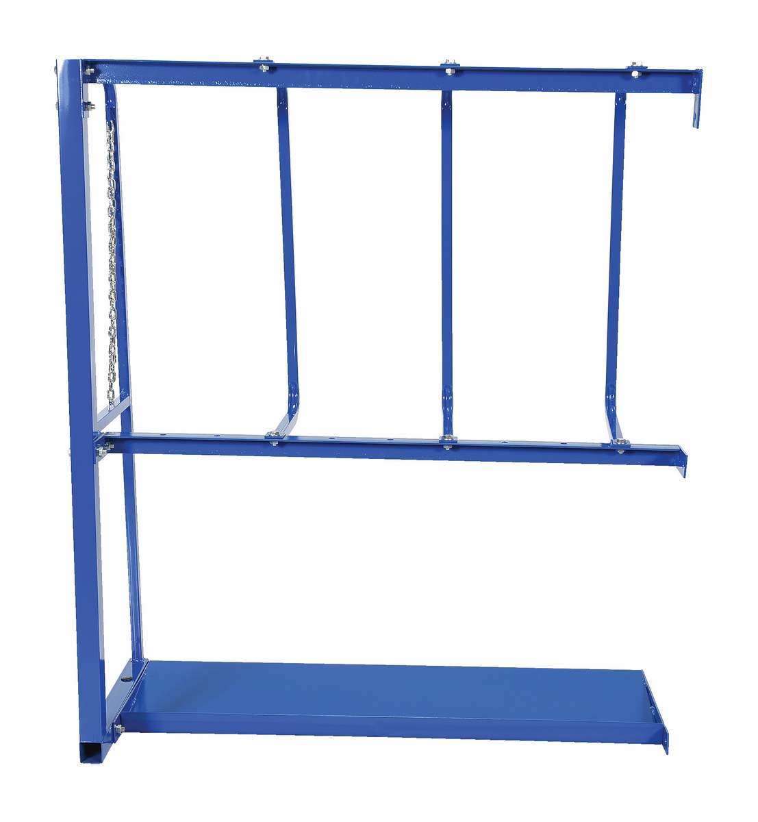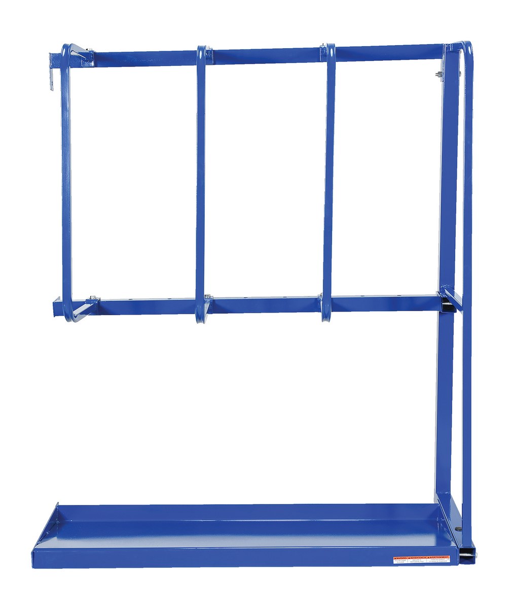 Expandable vertical bar rack is for storage of long parts. Designed to be placed up against a wall. Welded steel construction with blue painted finish.
