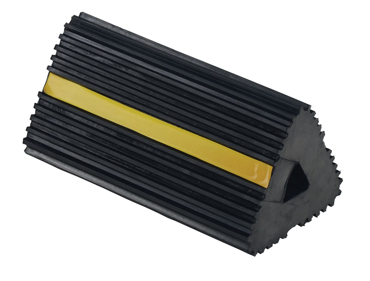 The rubber Wheel Chock is constructed of reinforced rubber to provide a sure grip on virtually any surface. The curved surface contours to fit tires. Rubber resists tearing, abrasion, ozone weathering, etc. The functional design is durable in all weather conditions.