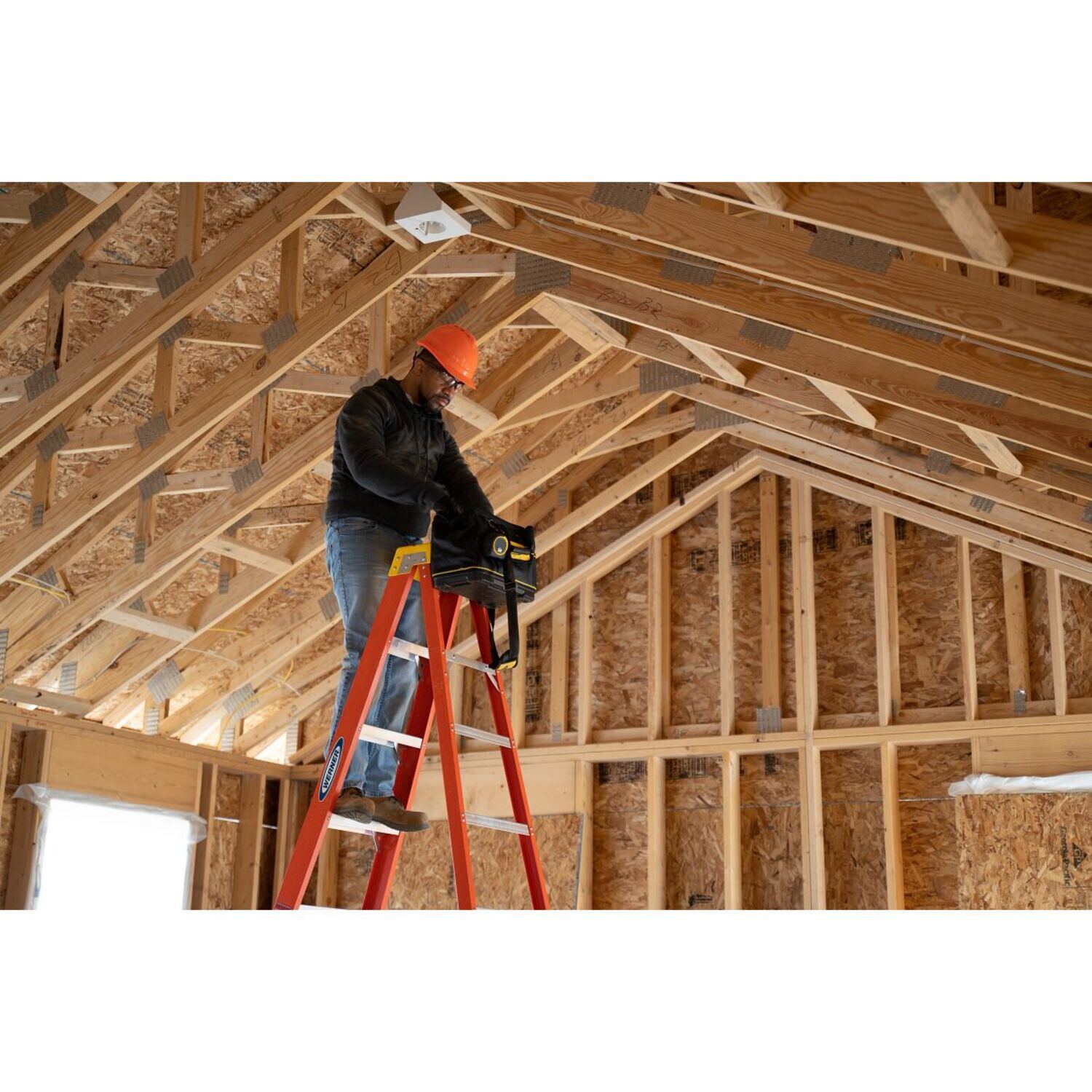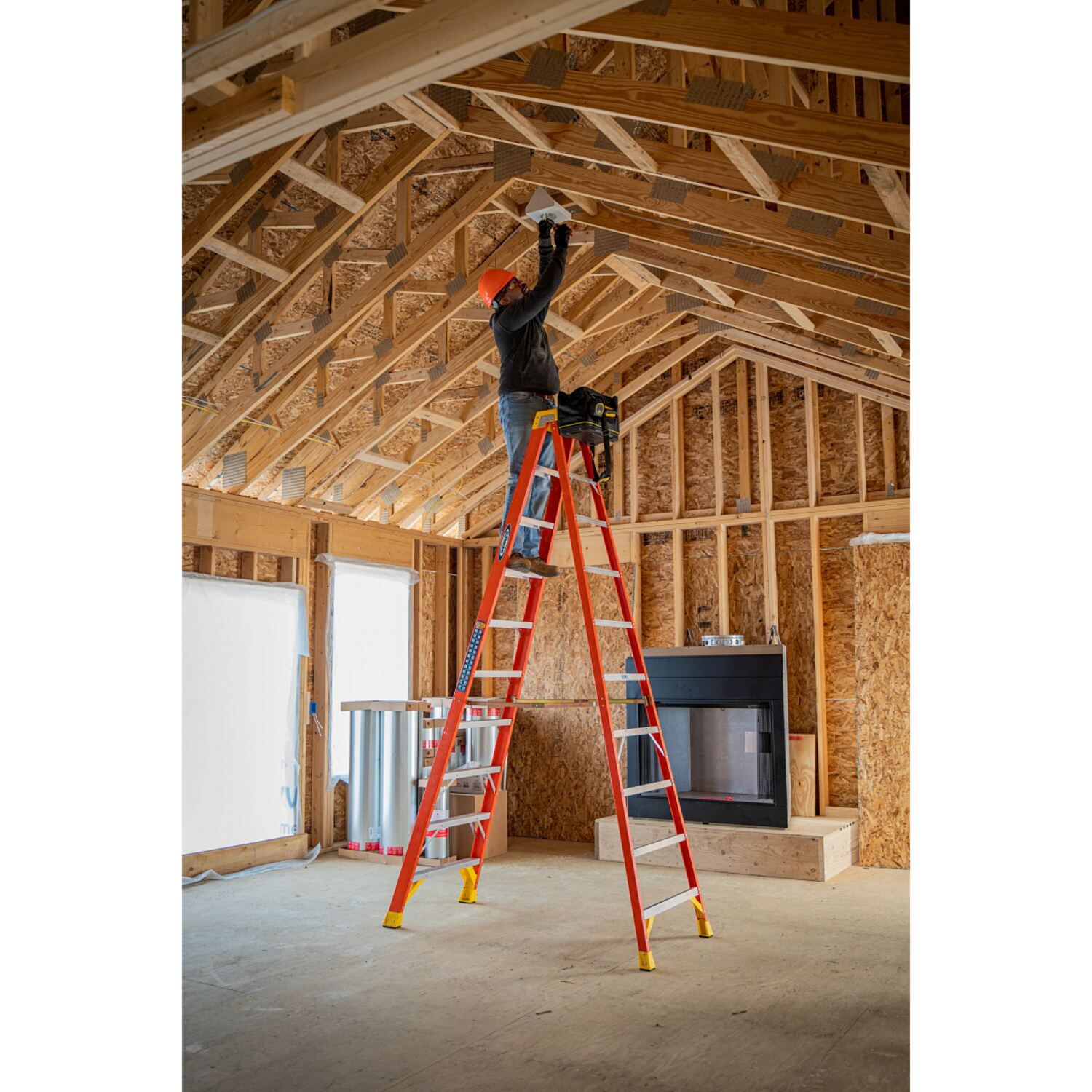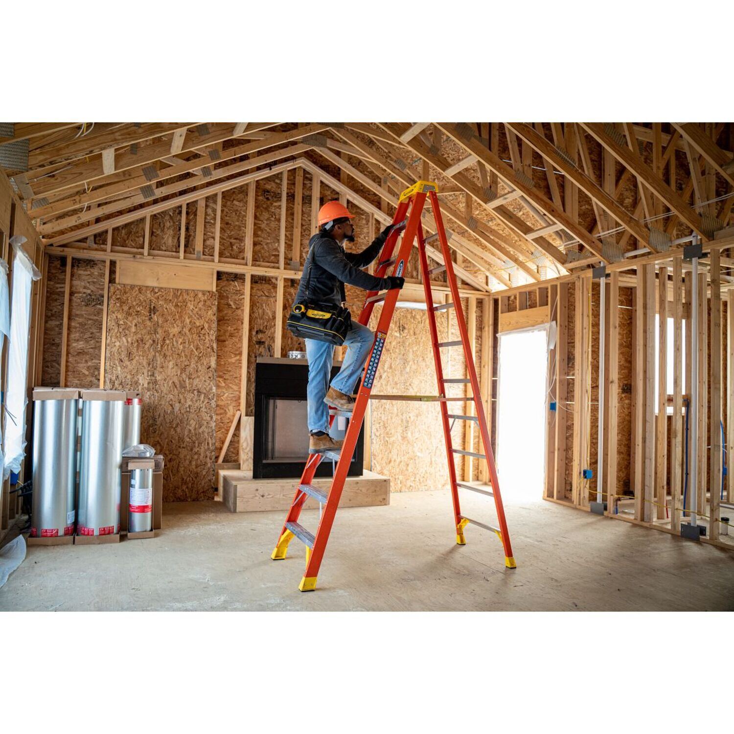 • Fiberglass stepladder is equipped with slip-resistant footing
