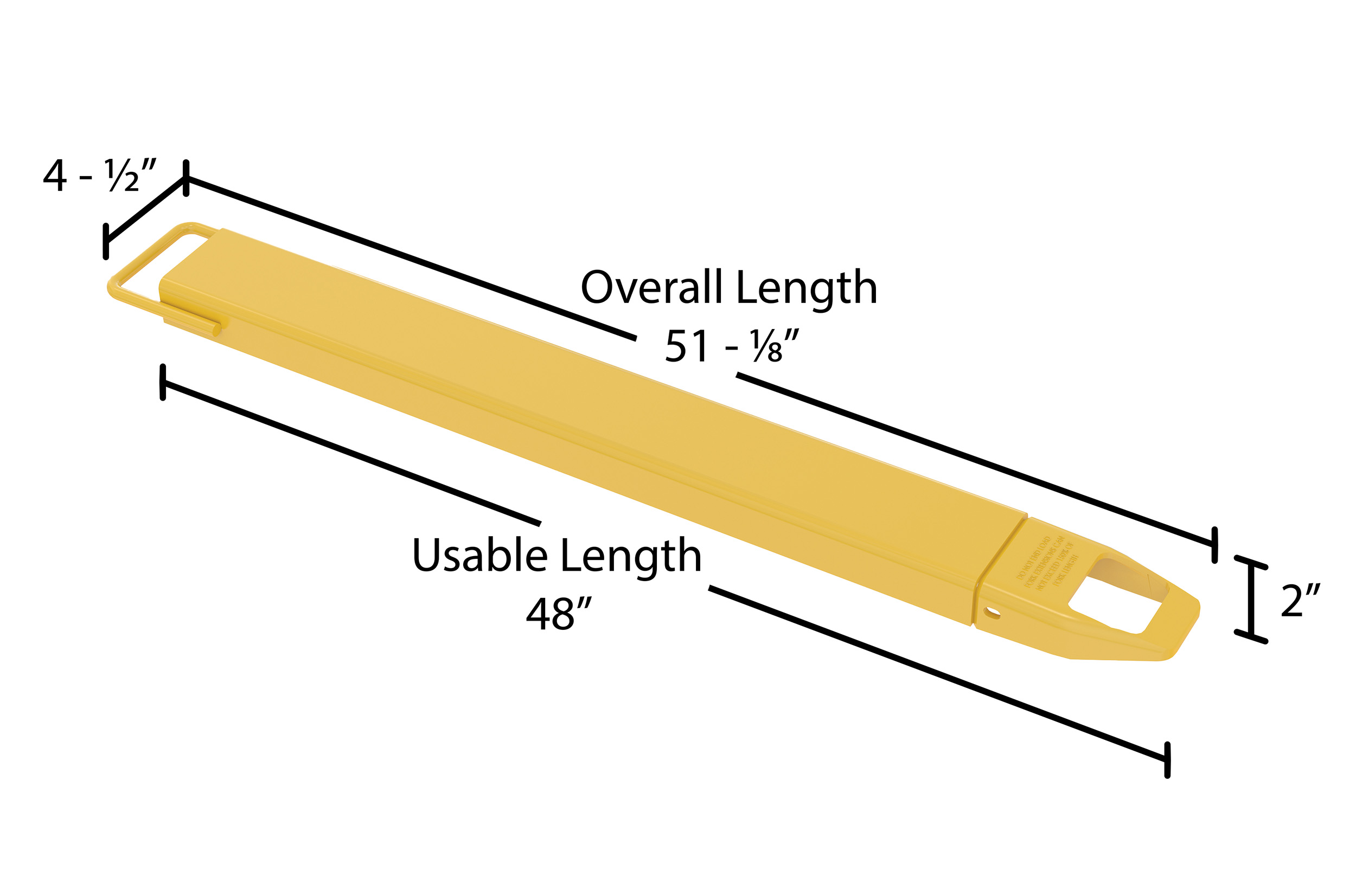 Provide the extra support needed to lift long or large objects with a fork truck using a pair of fork extensions. Welded steel construction with cast steel tips. Steel retaining strap prevents fork extensions from sliding off forks during use. Powder coat yellow finish. OSHA regulations require that extensions are no more than one-hundred and fifty (150) percent of the existing fork length. Insert loop at the tip of the fork and slide it up at a forty-five (45) degree angle. Then, lay it down over the existing fork. To be used with class 2 and class 3 forks only.