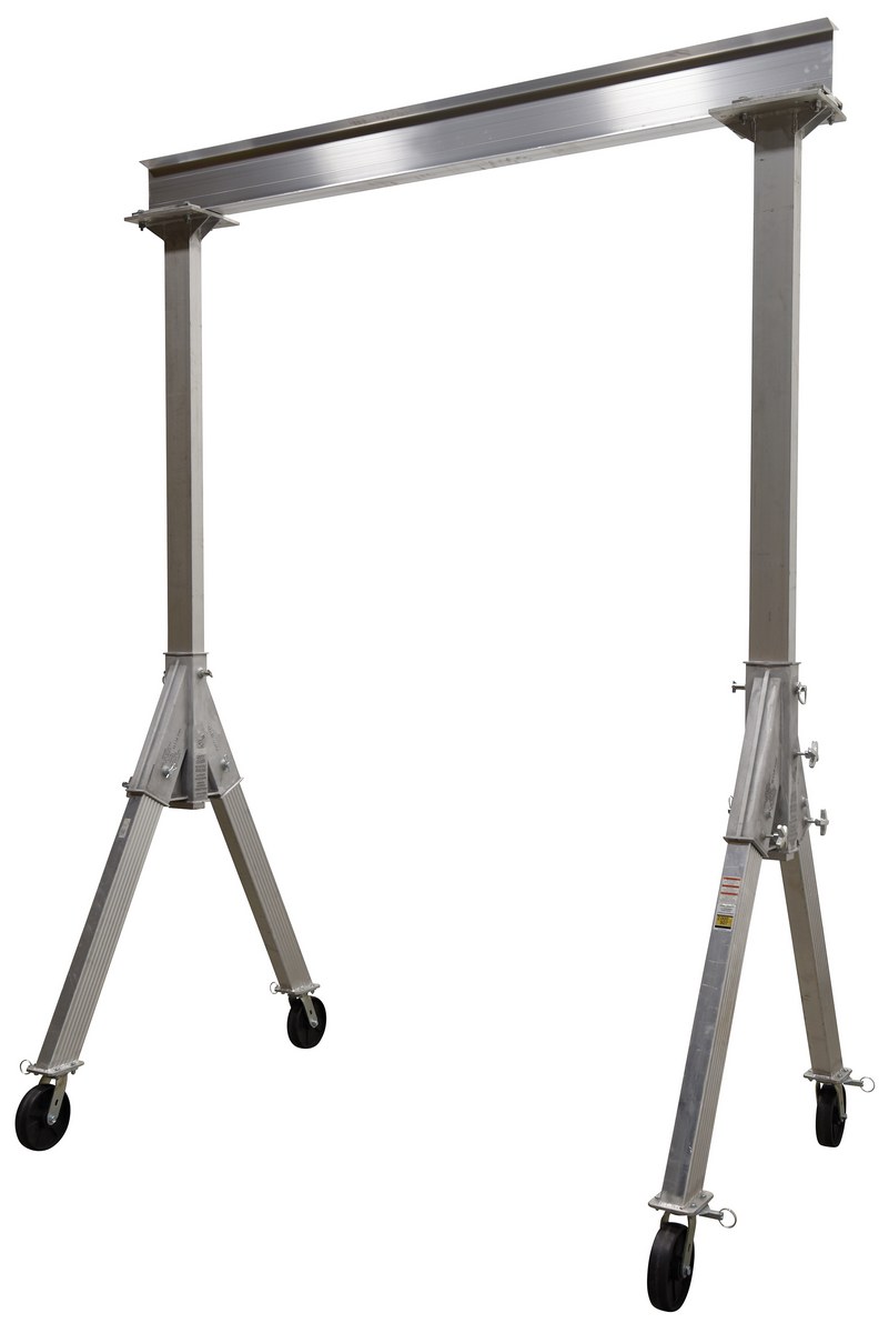 Aluminum Fixed Gantry Crane with Glass Filled Nylon Locking Casters 15 Ft. x 10 Ft. 2000 Lb. Capacity SilverThe fixed height Aluminum Gantry cranes are ideal for the manufacturing and maintenance facilities. The aluminum construction is easily manageable and can be simply assembled for immediate use. The unit has a fixed height for working in a permanent or semi-permanent environment. The casters allow the user to move the crane from workstation to workstation and smoothly roll over rough surfaces, while not marring. Do not move units while loaded.
